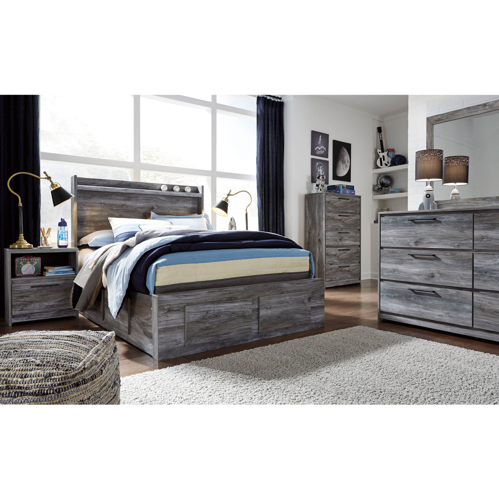Drift off in style with the Baystorm Bedroom Set, where casual coastal charm meets modern functionality. With its driftwood-inspired smoky gray finish, LED lighting, and sleek, fuss-free lines, this set captures the feeling of a relaxed beachside retreat. Thoughtful details like underbed drawers and built-in USB charging keep your space effortlessly organized and easy to unwind in.