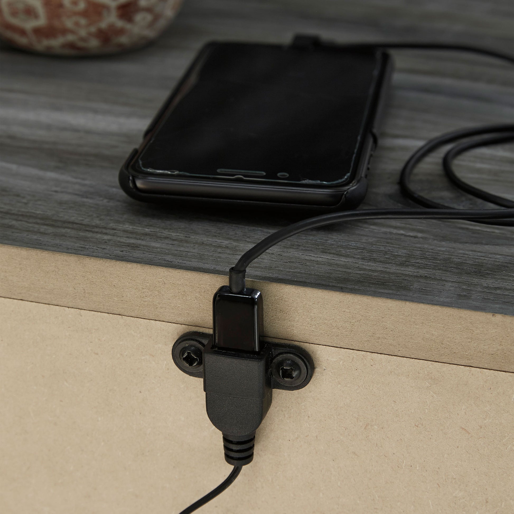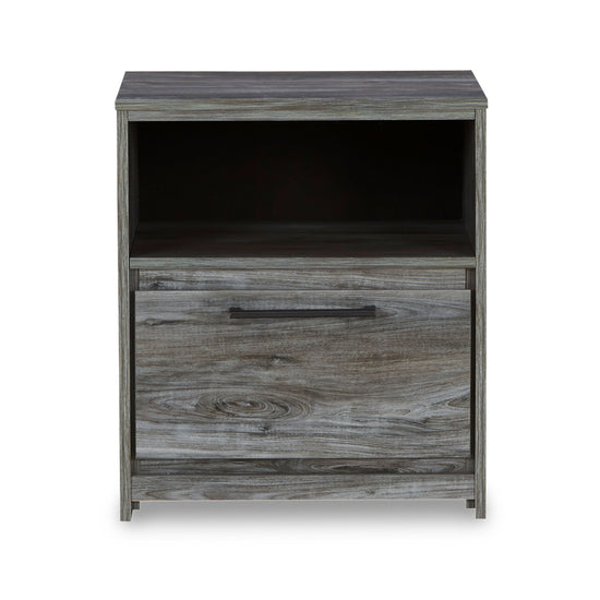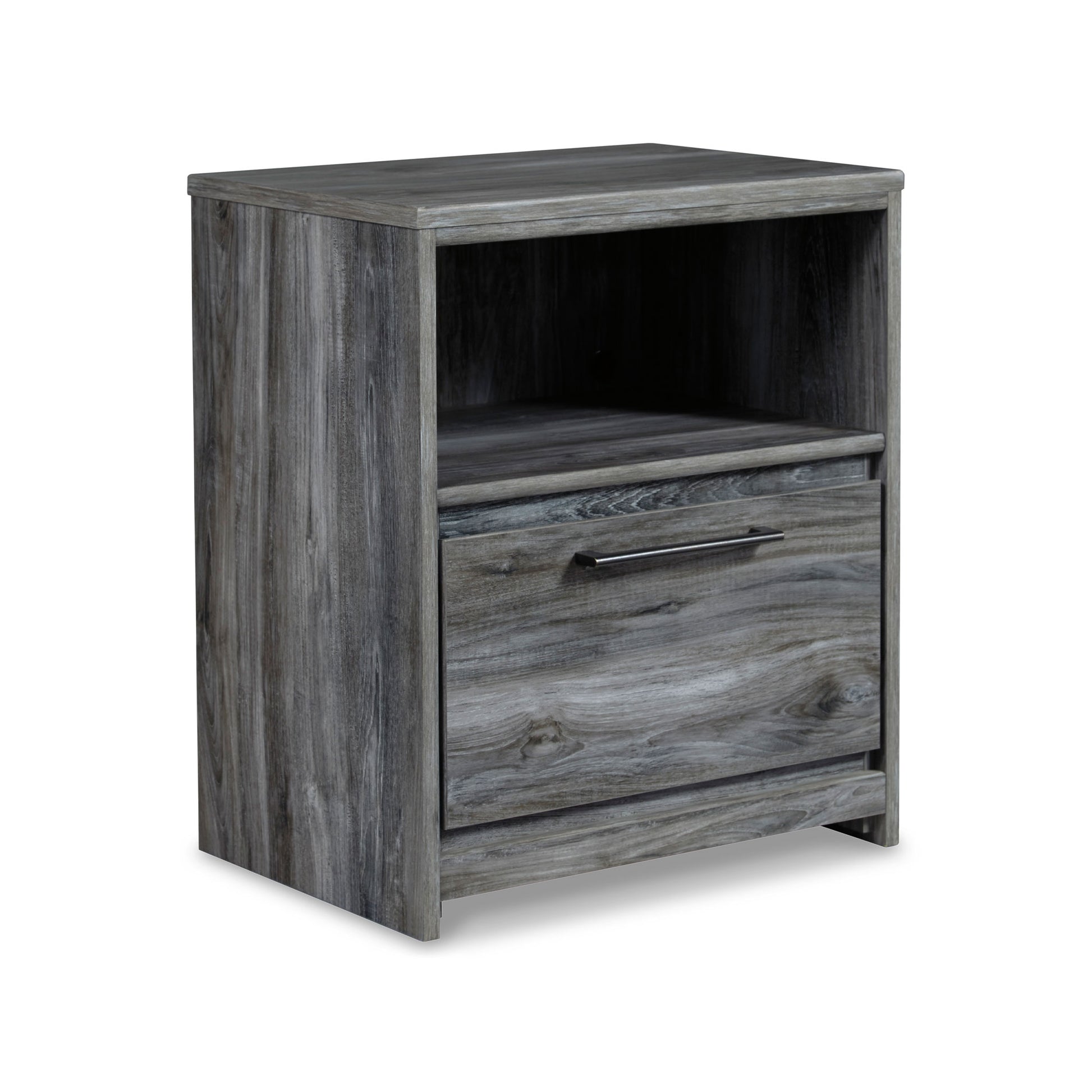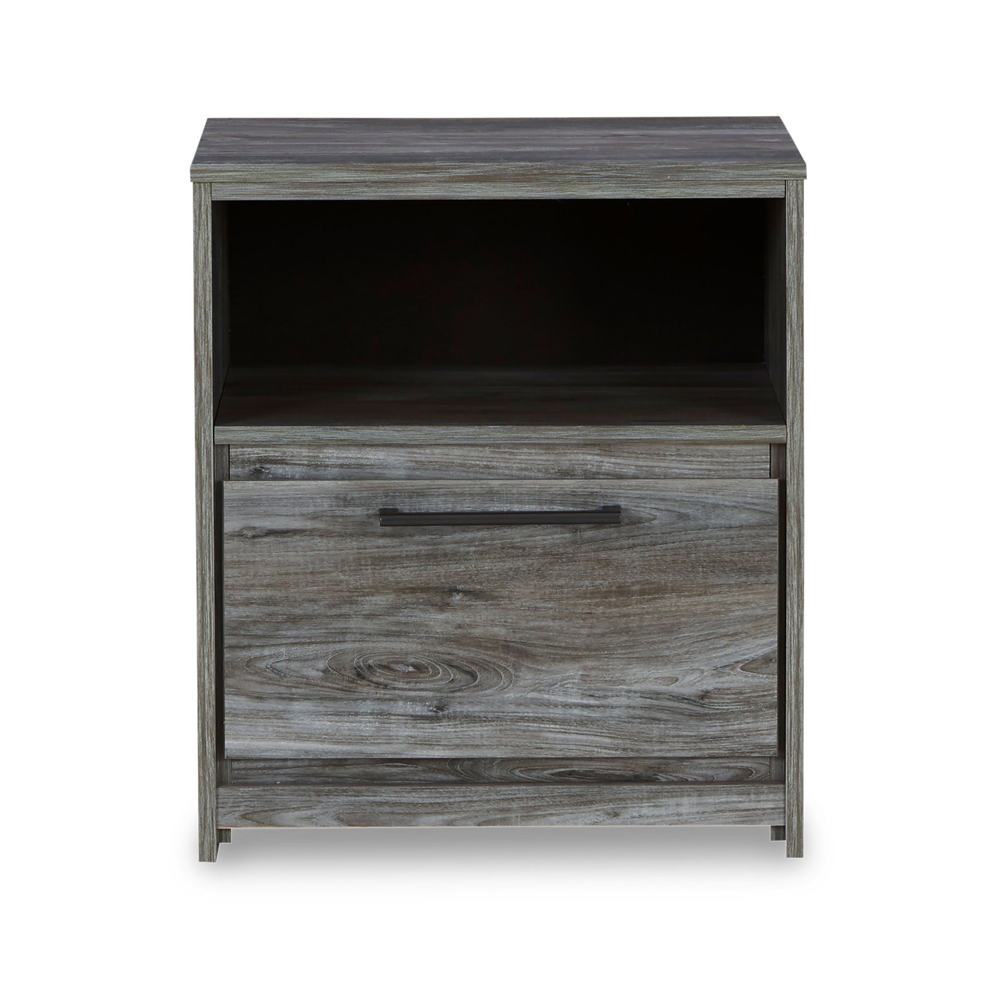 Nightstand includes one drawer, an open cubby, and a USB charging station for added convenience