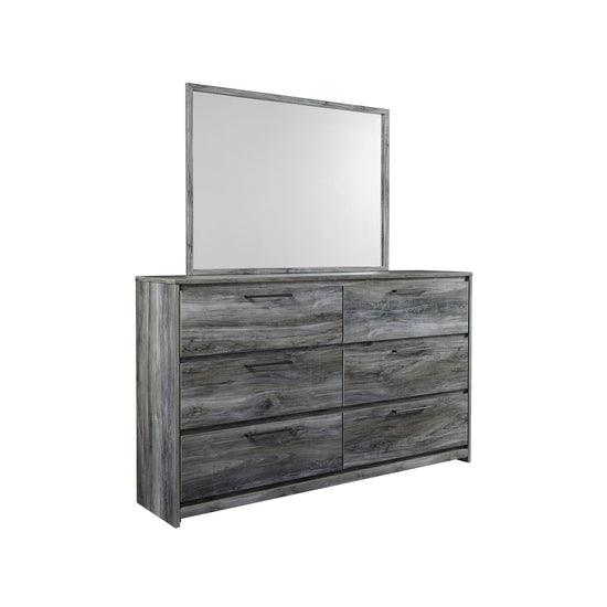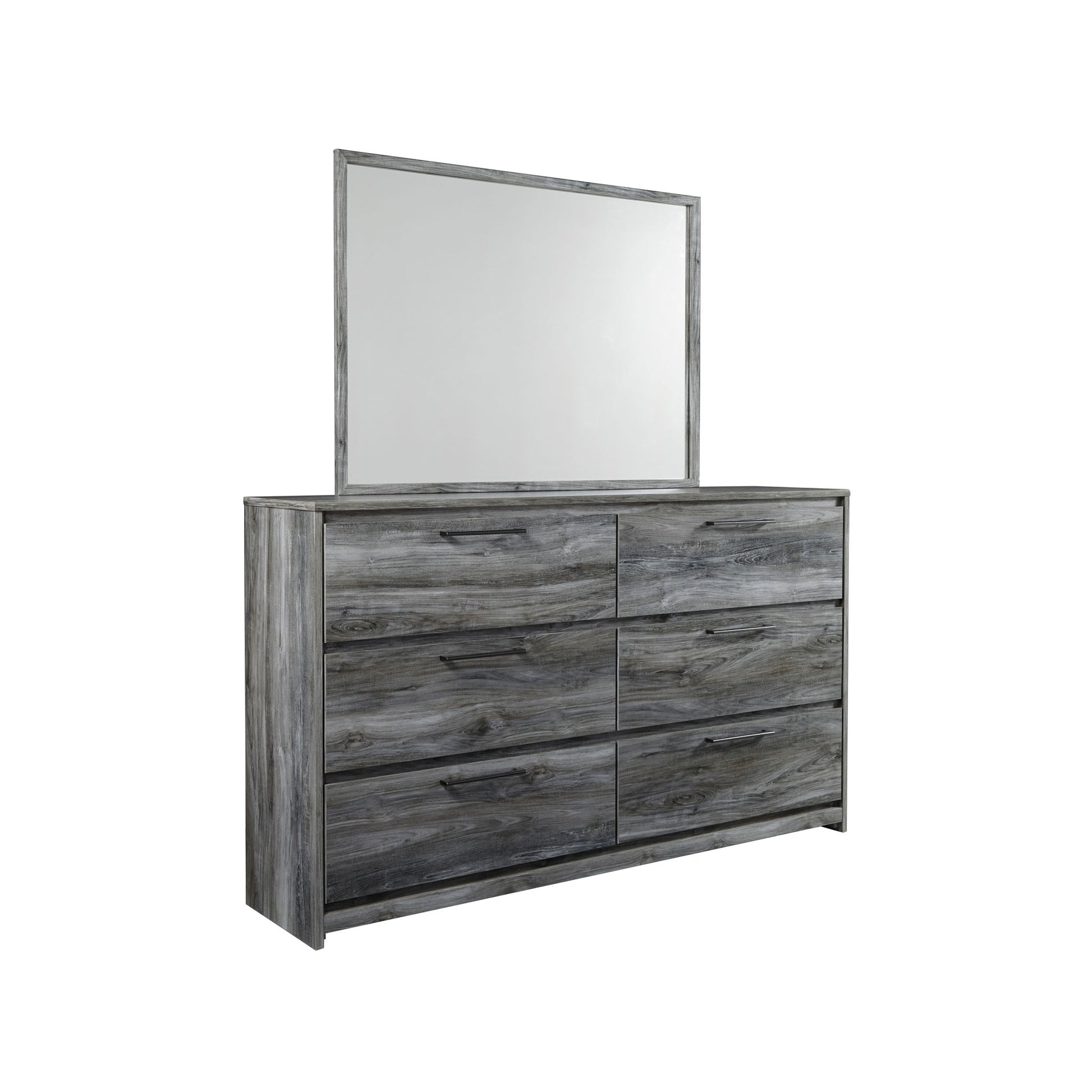 Dresser and mirror feature six smooth-gliding drawers with antiqued gunmetal-tone pulls