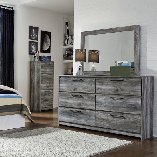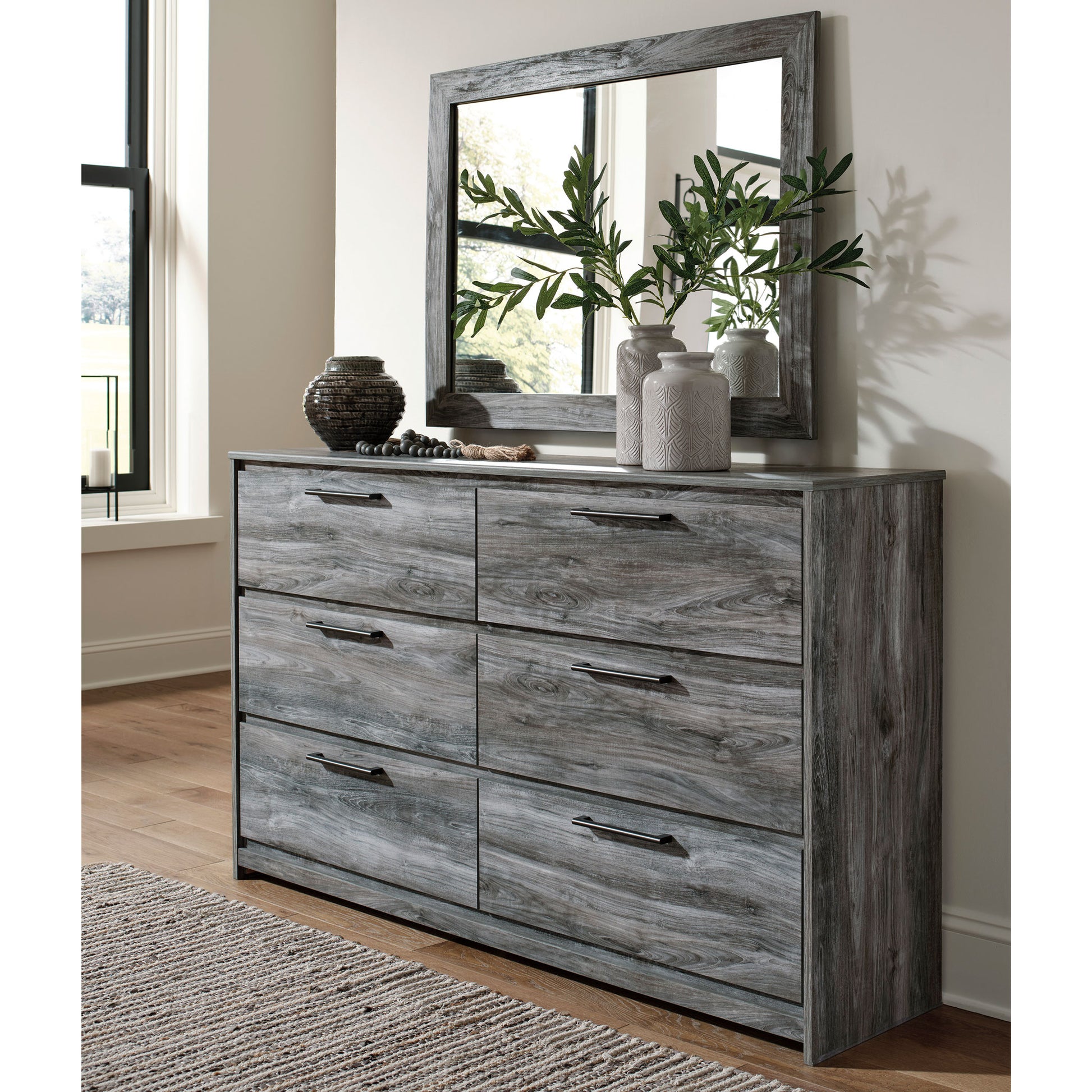 Casually cool style and lots of storage go hand in hand with this dresser with mirror. Its driftwood and smoky finish create an easy-going vibe that's perfect for setting the scene of a relaxed getaway. Six roomy drawers give you the space needed for stowing away clothes and more. Clean lines and modern handles provide a fuss-free look.