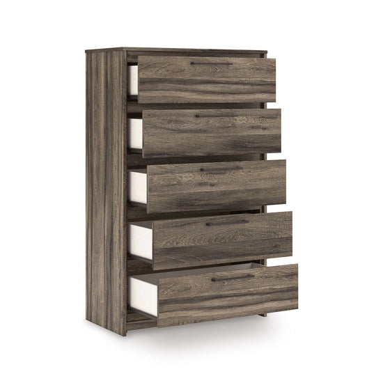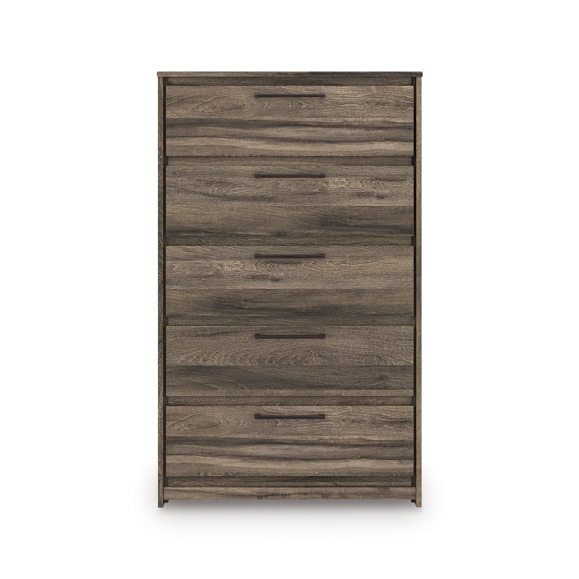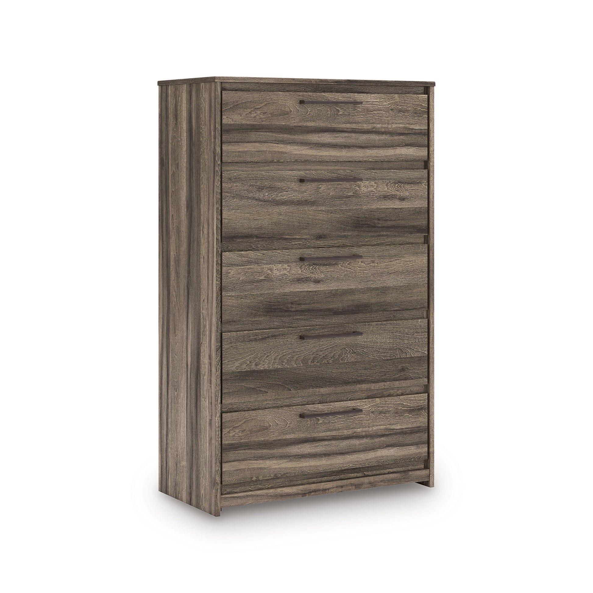 Casually cool style and lots of storage go hand in hand with this chest of drawers. A weathered brown finish over replicated oak grain creates an easygoing vibe, setting the scene in your restful retreat. Clean lines and modern handles provide a fuss-free look. And the chest's five roomy drawers give you plenty of space for stowing away clothes and more.