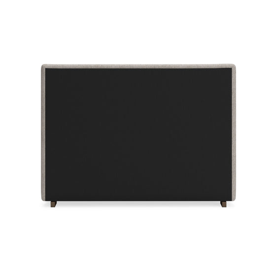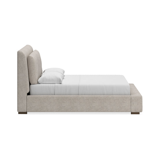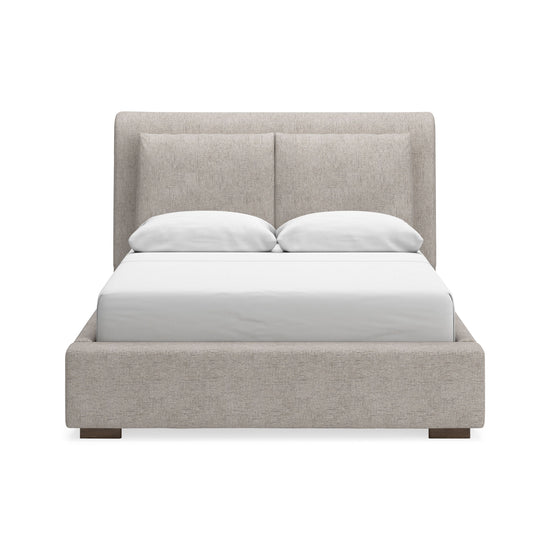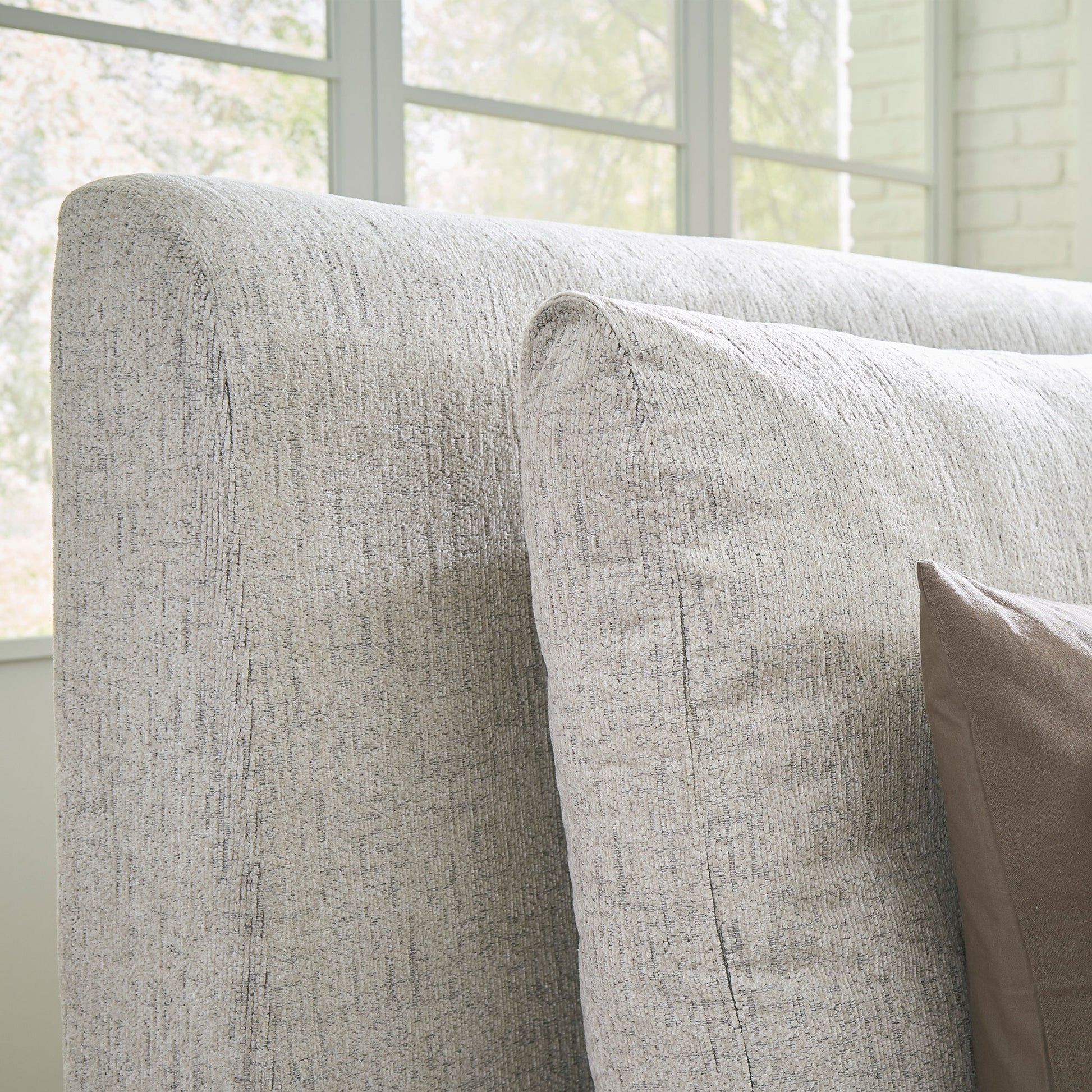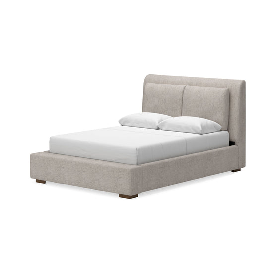 Upholstered bed features a subtly tapered headboard with loose pillows for added comfort