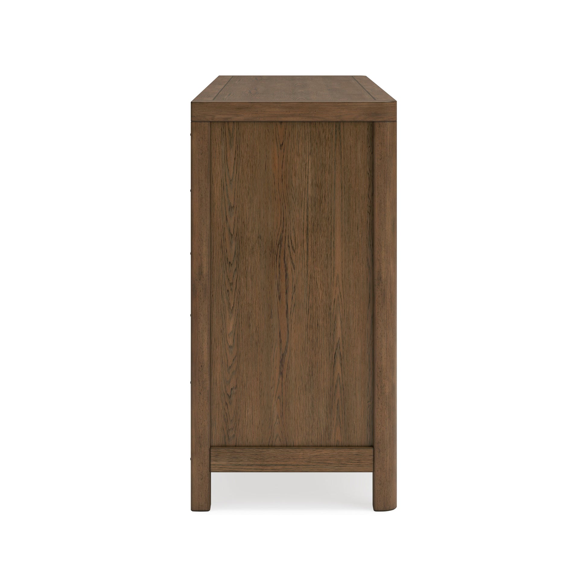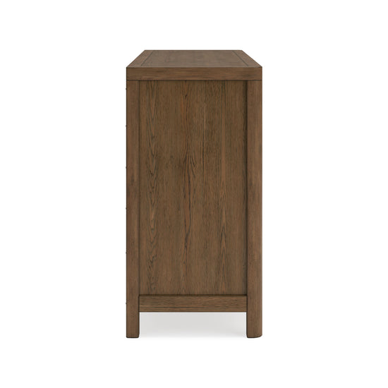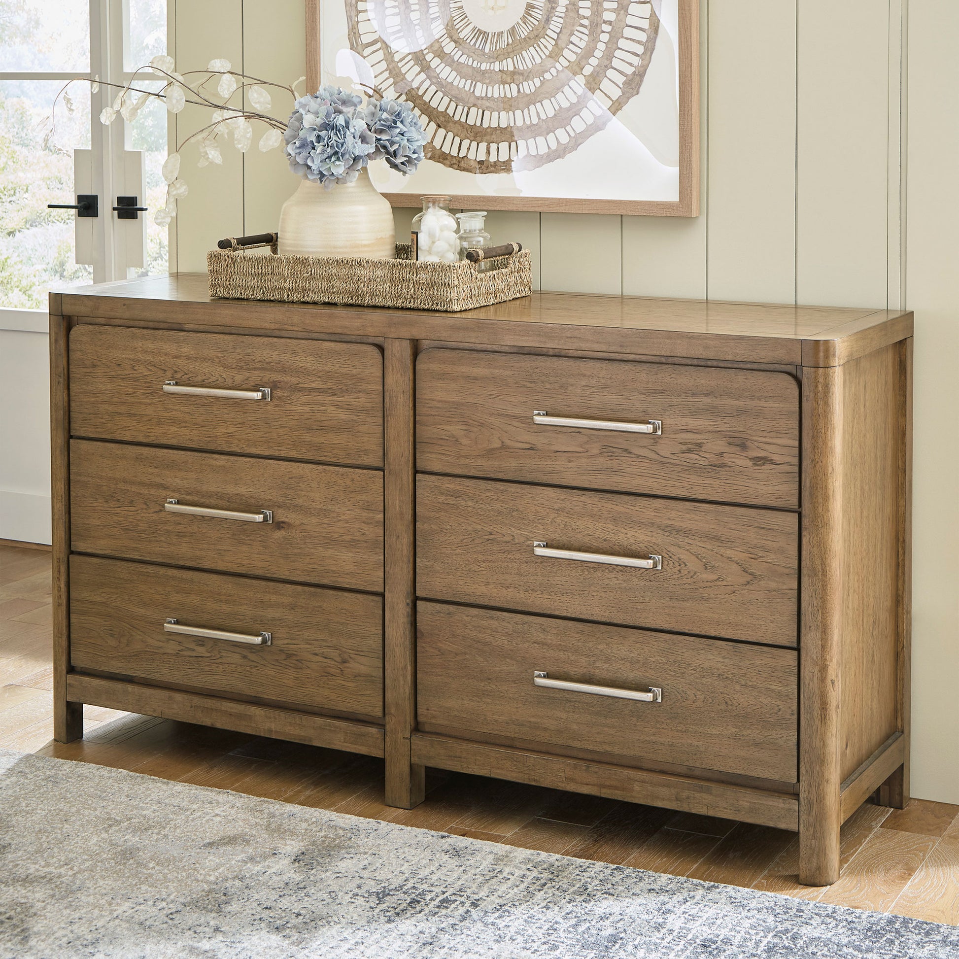 This dresser sits comfortably at the intersection of modern lodge and farmhouse aesthetics. Your warm and welcoming disposition is reflected in the charming architectural elements and light brown glazed finish. Even with its poise, the dresser remains practical. Smooth-gliding drawers tuck away necessities, defining your bedroom with reliable function and style.