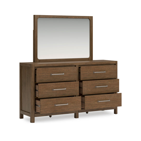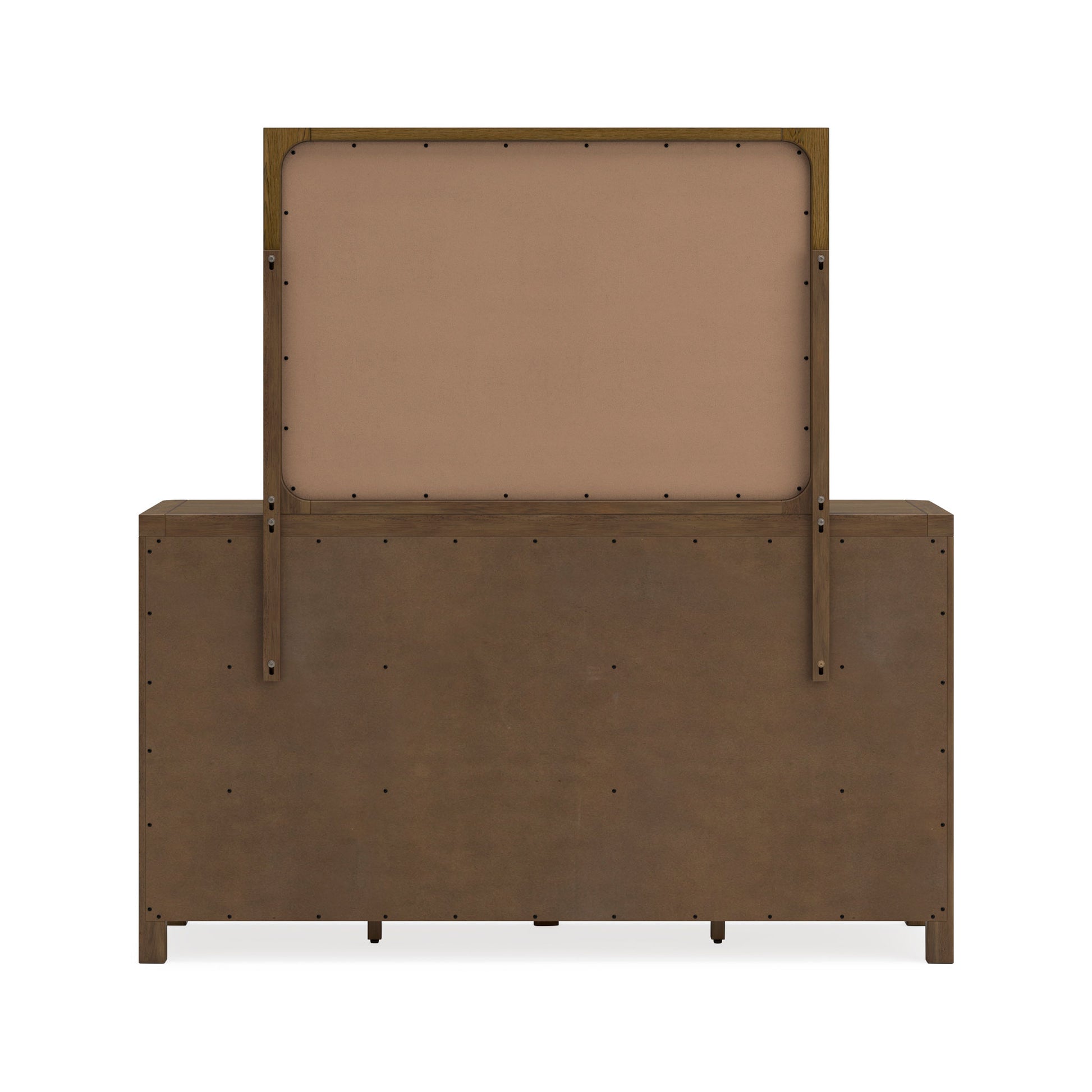 This dresser with mirror sits comfortably at the intersection of modern lodge and farmhouse aesthetics. Your warm and welcoming disposition is reflected in the charming architectural elements and light brown glazed finish. Even with its poise, the piece remains practical. Smooth-gliding drawers tuck away necessities, defining your bedroom with reliable function and style.