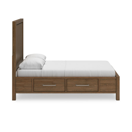 This panel bed with storage sits comfortably at the intersection of modern lodge and farmhouse aesthetics. Your warm and welcoming disposition is reflected in its charming architectural elements and light brown glazed finish. Even with its poise, the bed remains practical. Storage drawers are effective space-savers, defining your bedroom with reliable function and style.