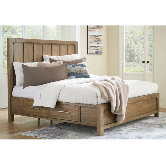 - Includes panel headboard, footboard with roll slats, storage rails and storage drawers