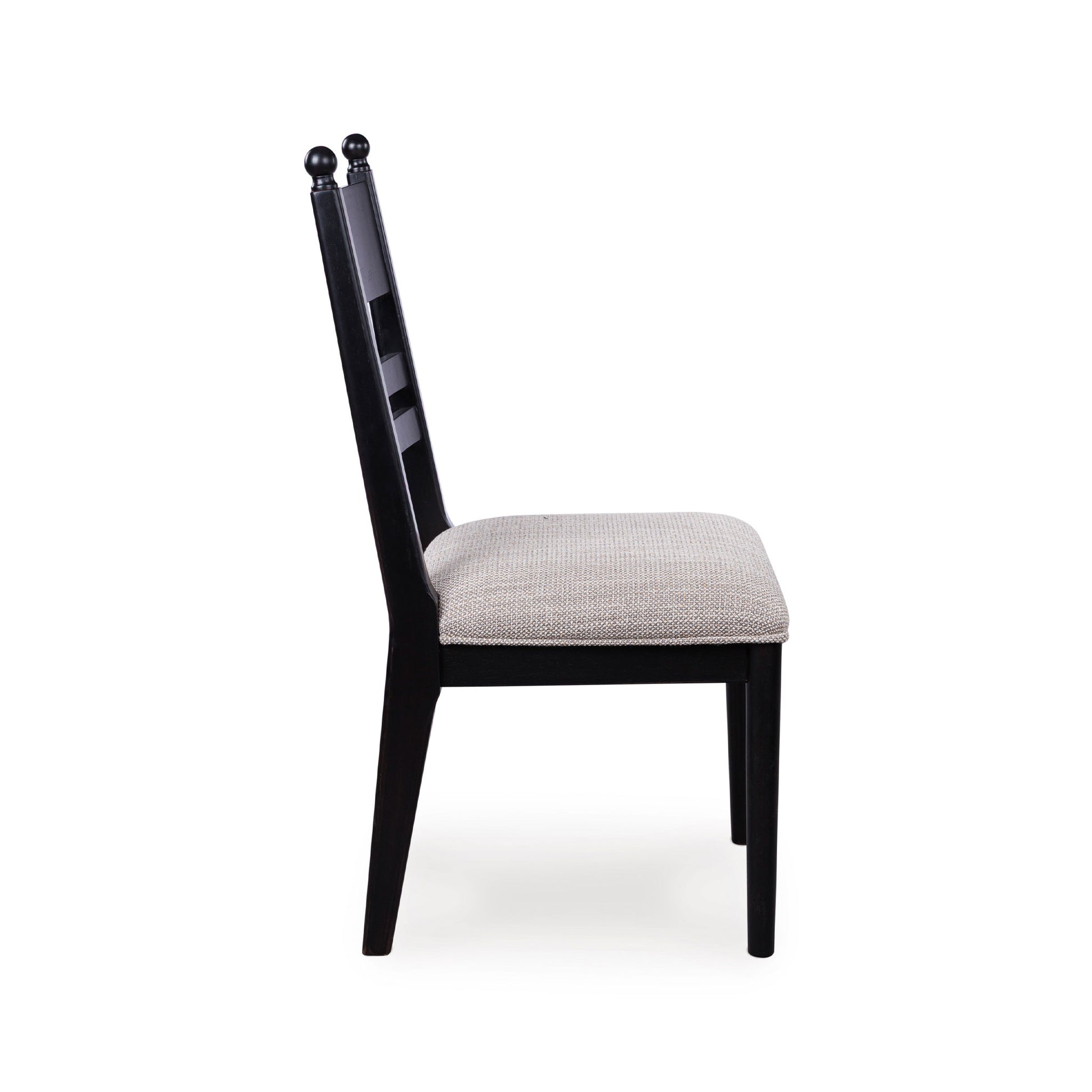 Ladderback chairs with solid wood frames, black finish, and cushioned polyester seats