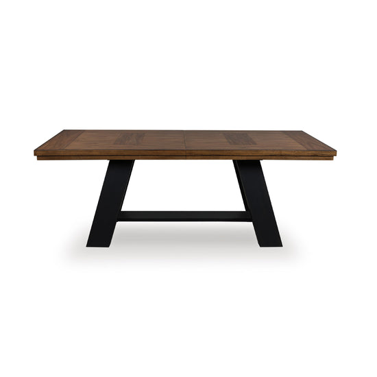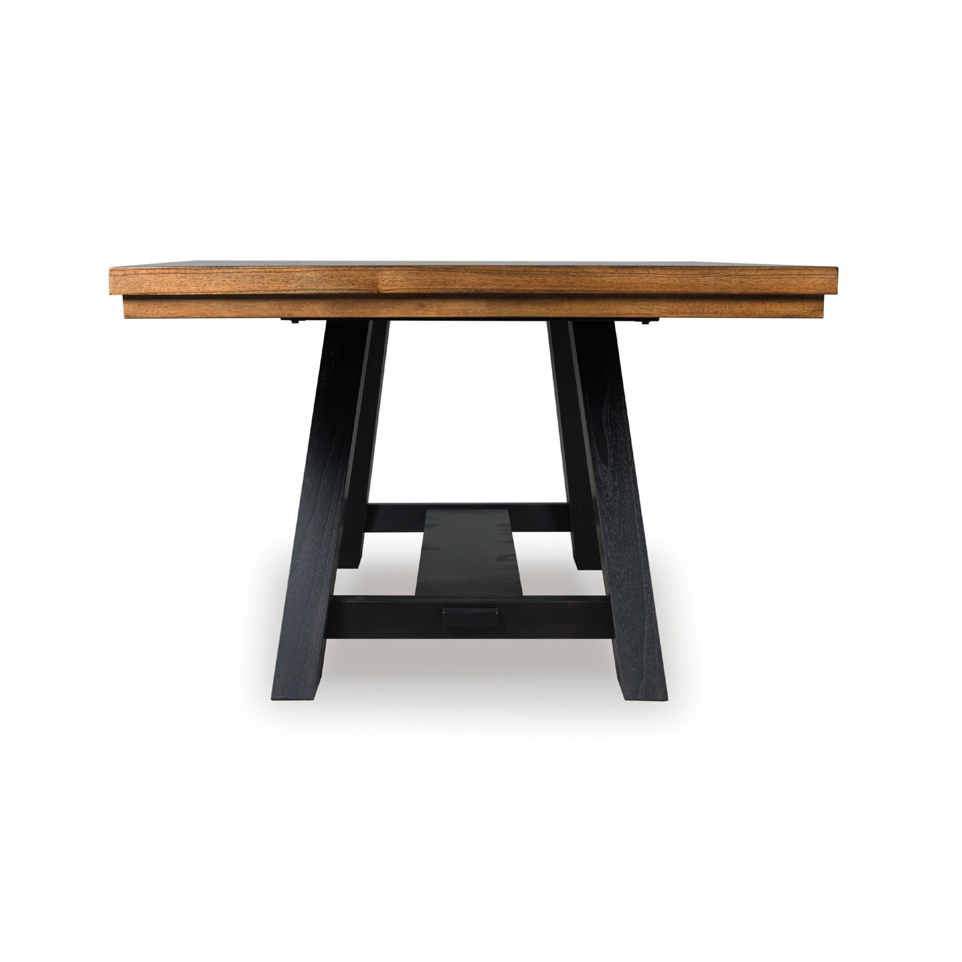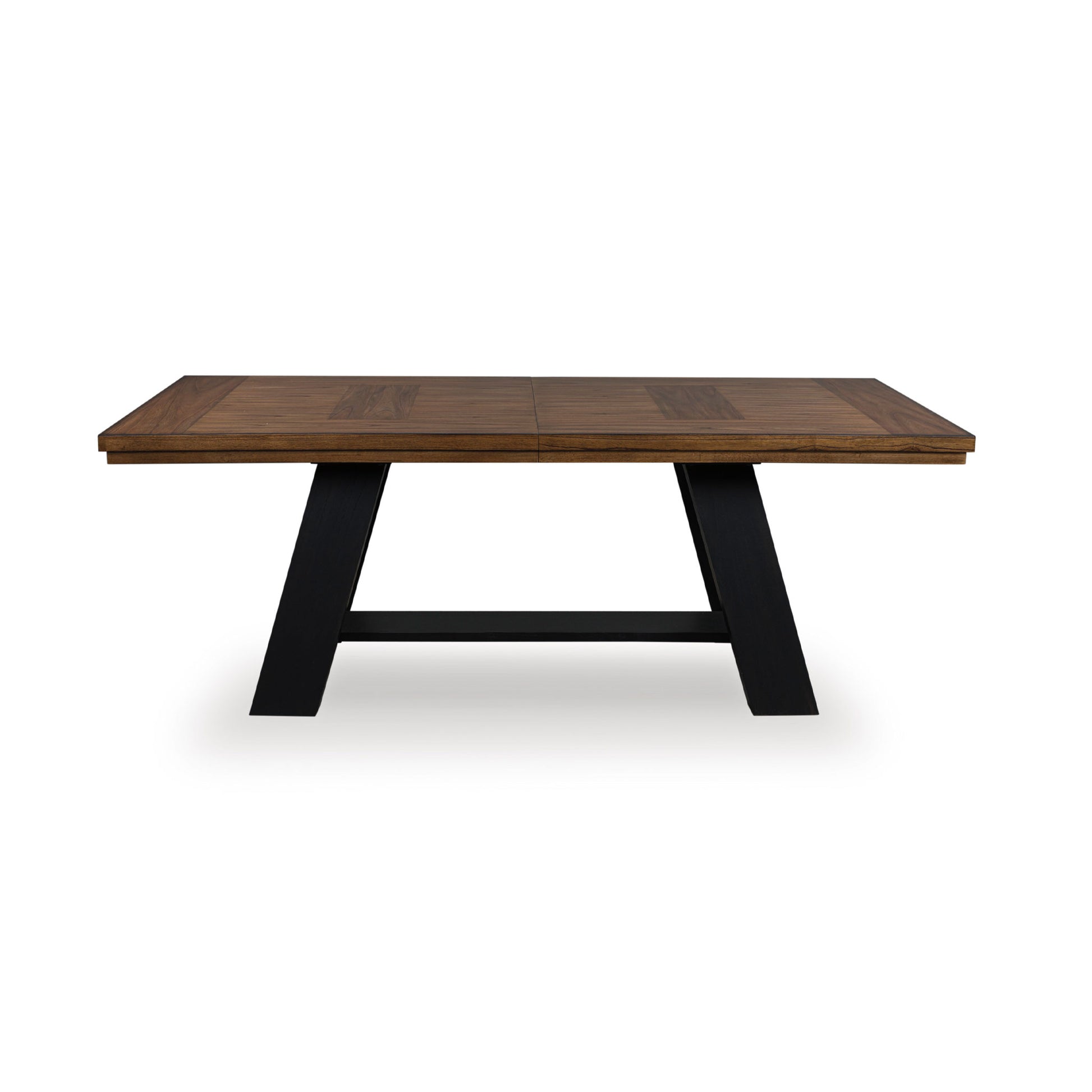 Two-tone dining table featuring a medium brown mindi wood veneer inlay top and black painted base
