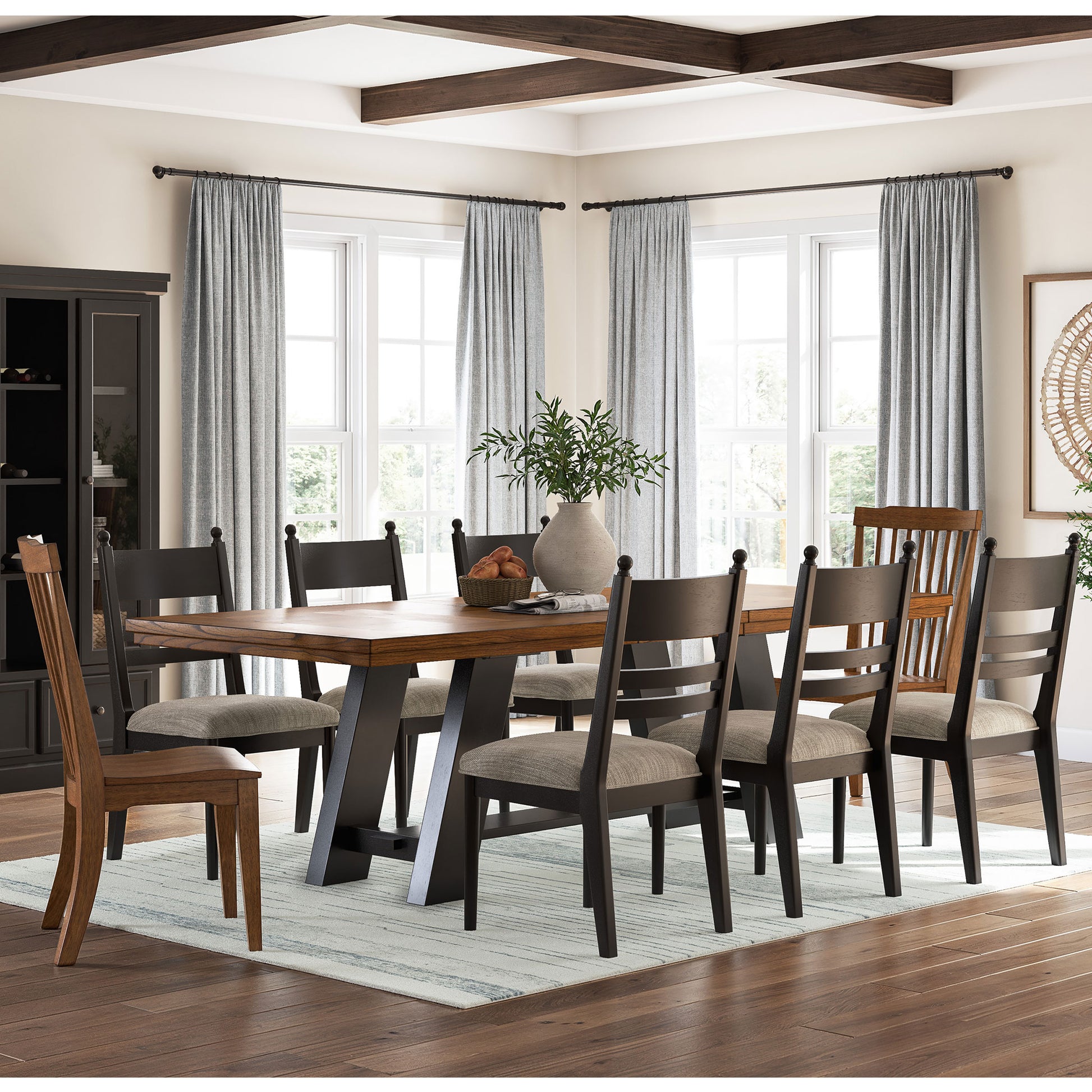 Relaxed living and cozy comfort—that’s what modern farmhouse design is all about. And what better way to embrace your love of rustic country style than with this two-tone dining extension table. Celebrating the beauty of simplicity, its chunky wood veneer inlay top and painted black base marry functionality with classic appeal for a fresh feel. This piece effortlessly pairs with assorted chairs in the collection for an eclectic look.