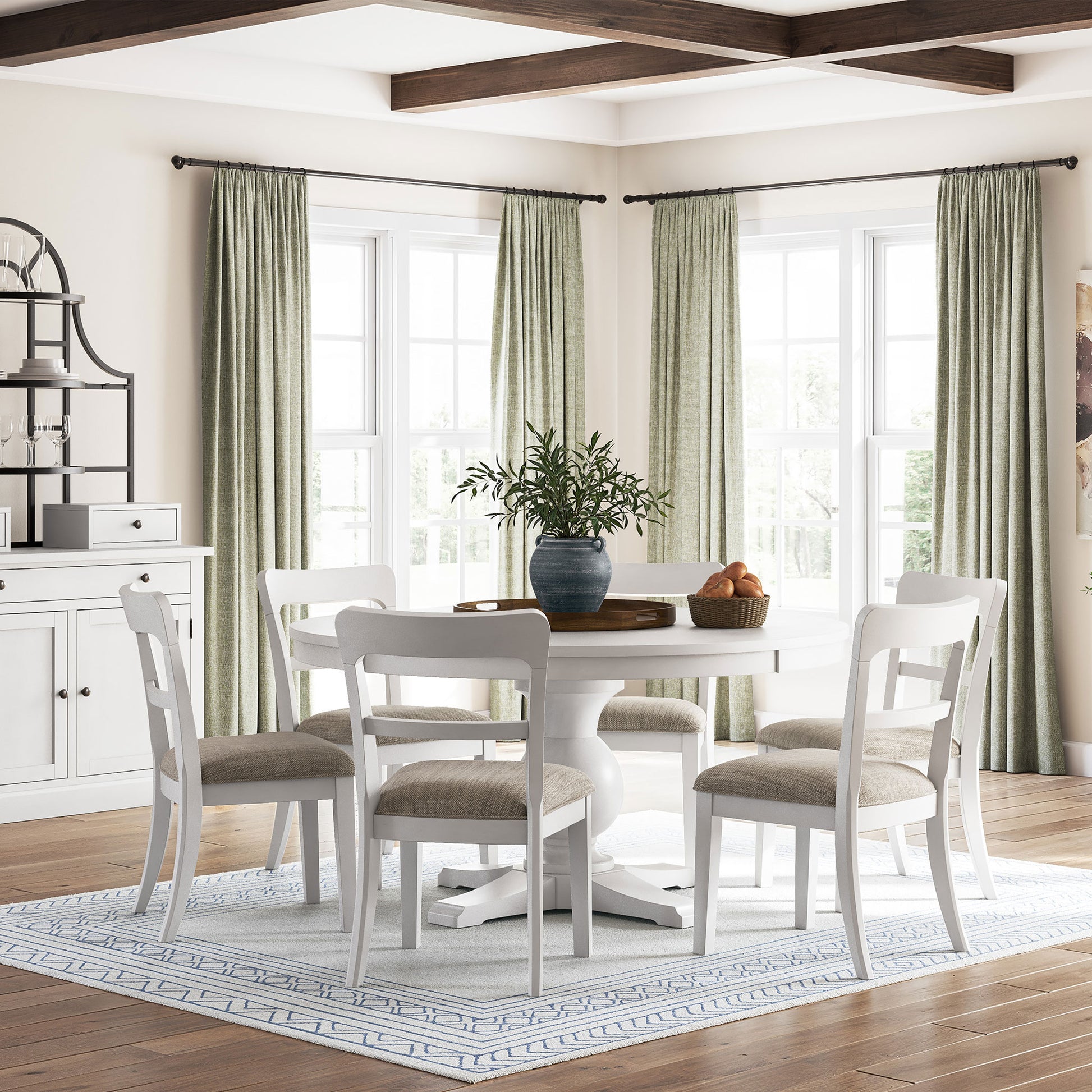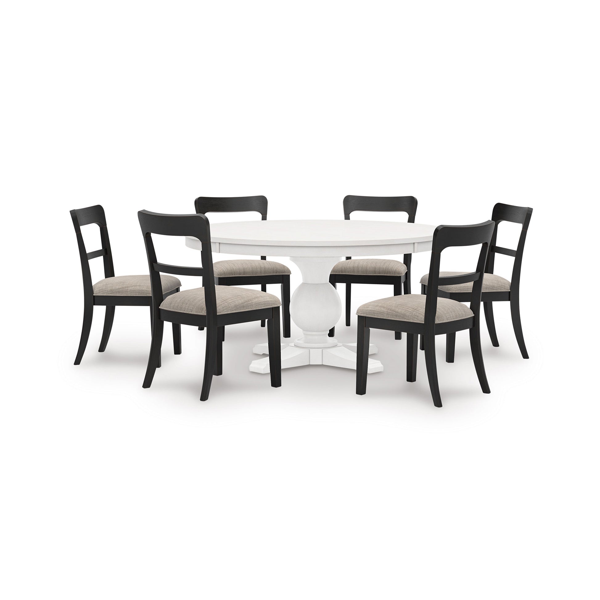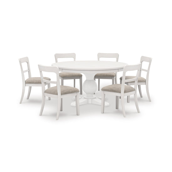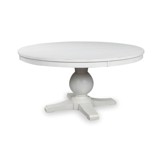 Create a welcoming space for gathering and good conversation with the Chadworth Round Dining Set. Rooted in traditional farmhouse design, this collection pairs vintage charm with everyday comfort. The round pedestal table features a thick antiqued white top and sculptural base for timeless appeal, while the bistro-style chairs bring warmth and character with their soft upholstered seats and classic silhouette.