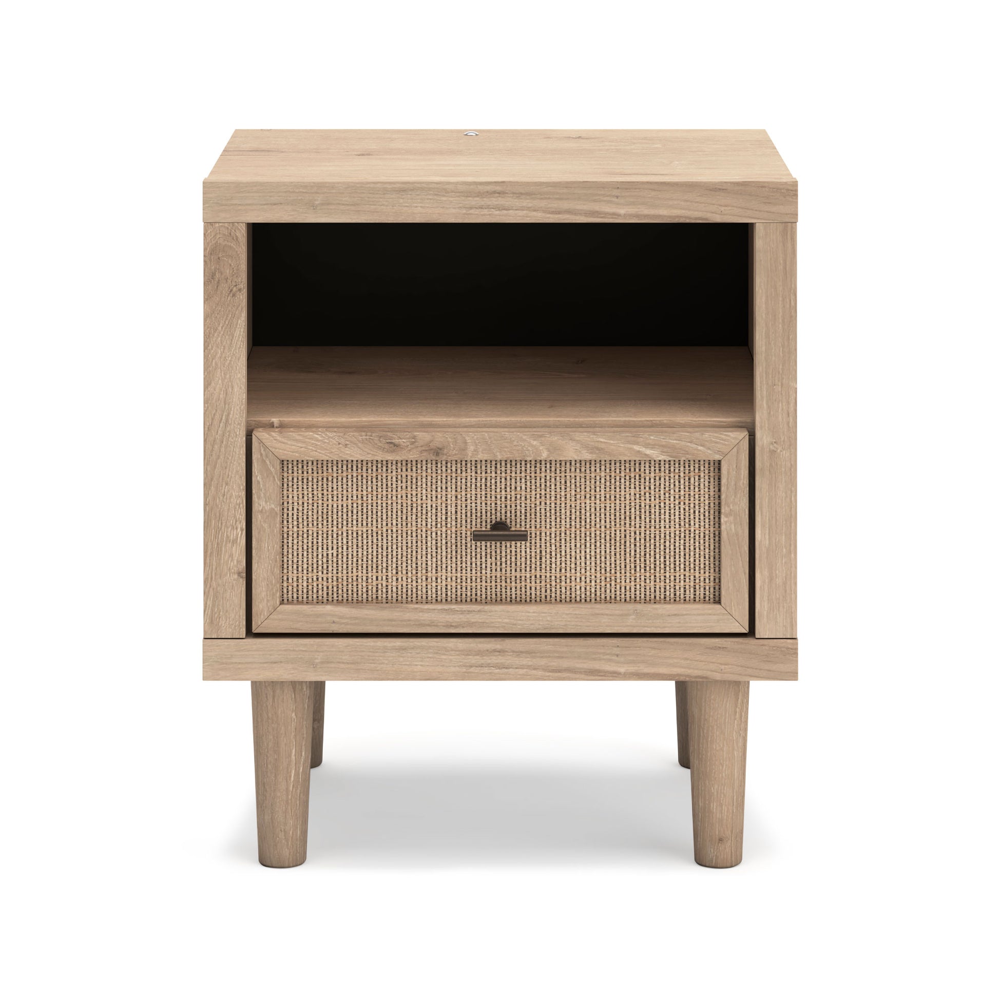 Clean-lined and contemporary—but far from stark—this nightstand is a fresh style awakening. Pairing a light finish with replicated oak grain and textured beige details that replicate the look of cane, its mixed materials bring a naturally versatile vibe to your bedroom. Sleek, simple hardware plays perfectly with the modern aesthetic. A smooth-gliding drawer and USB charging keep your clutter contained and your gadgets powered. Warm LED lighting not only illuminates your restful retreat but also adds a touch of unmatched style.