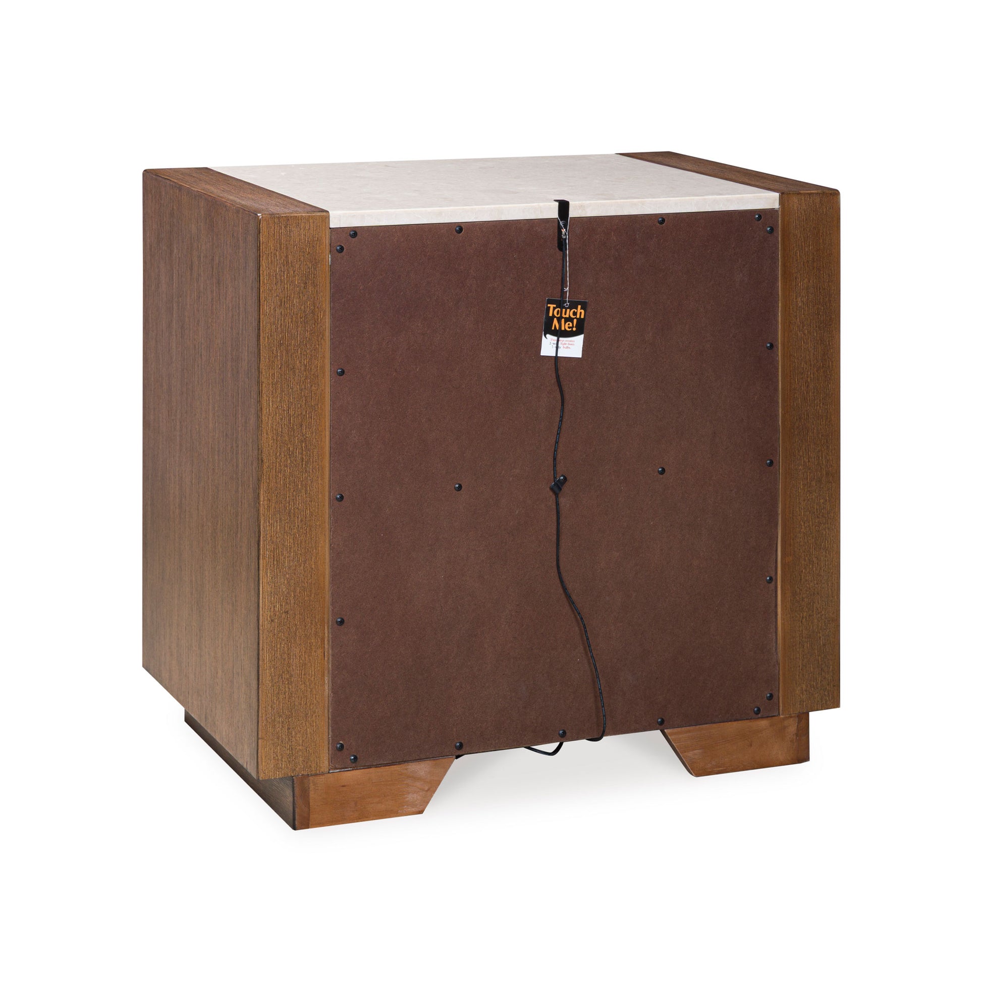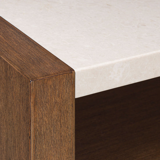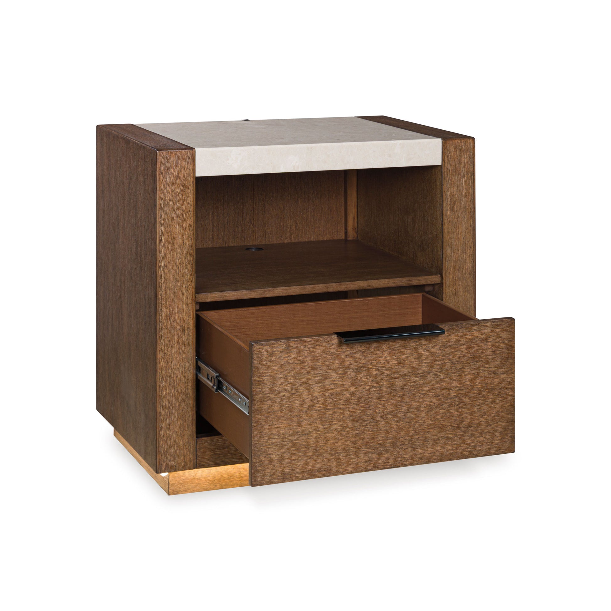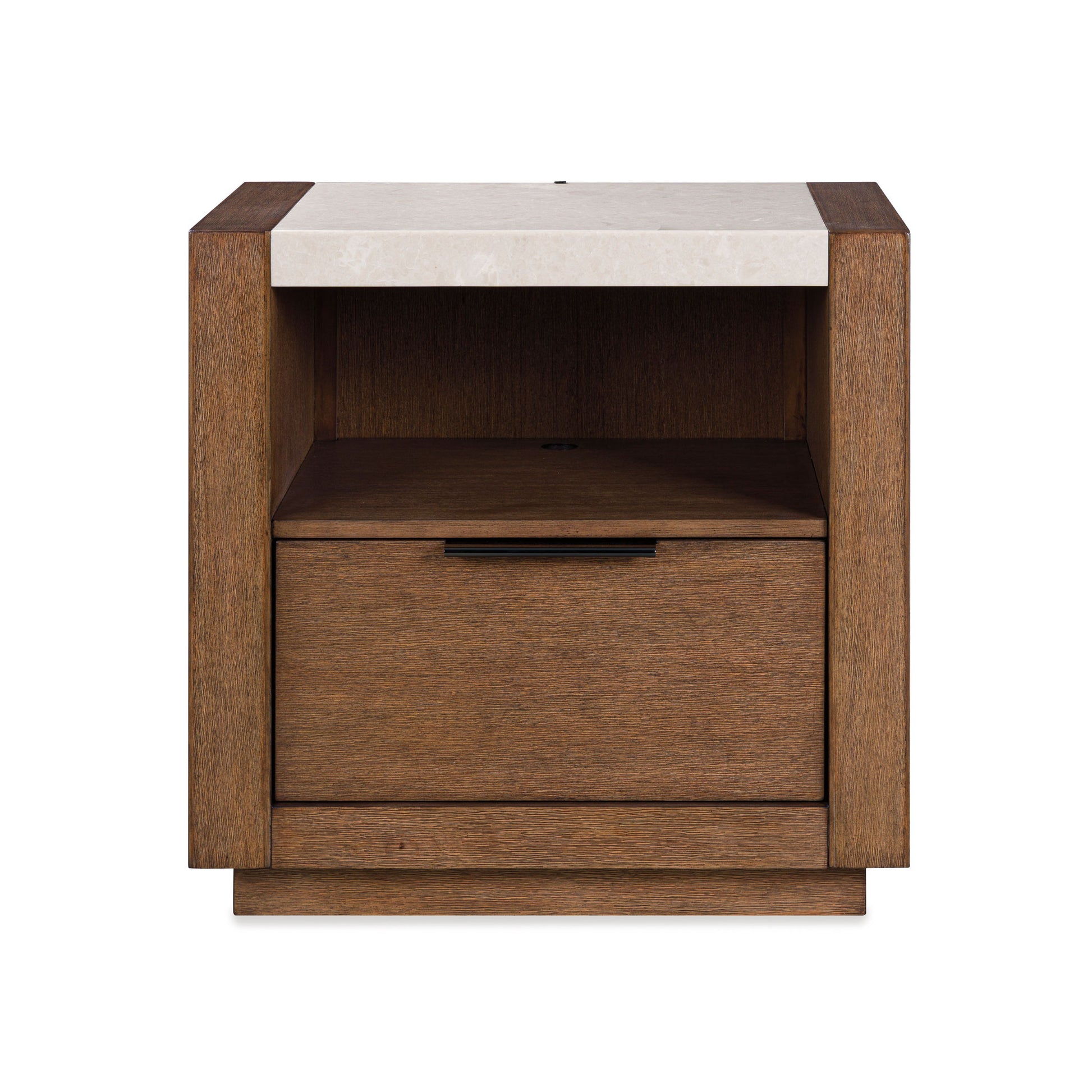 Get the luxe modern look you love at a price you can afford. This nightstand features a structured silhouette on a plinth base that elevates the piece to a modern masterpiece. It has a complex, yet versatile, two-toned look with its natural marble top. An open shelf and a self-closing drawer with nickel-tone pull provide just the right amount of storage space. The nightstand marries tech and clean-lined design with its LED night light illuminating the base on three sides. A dual USB charging port within the open shelf area adds extra functionality.