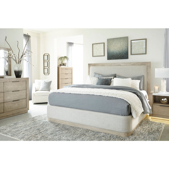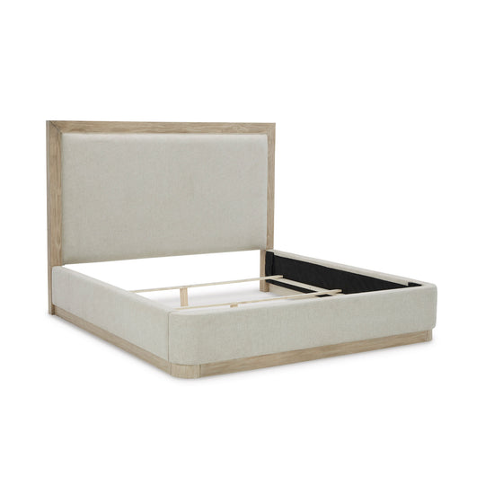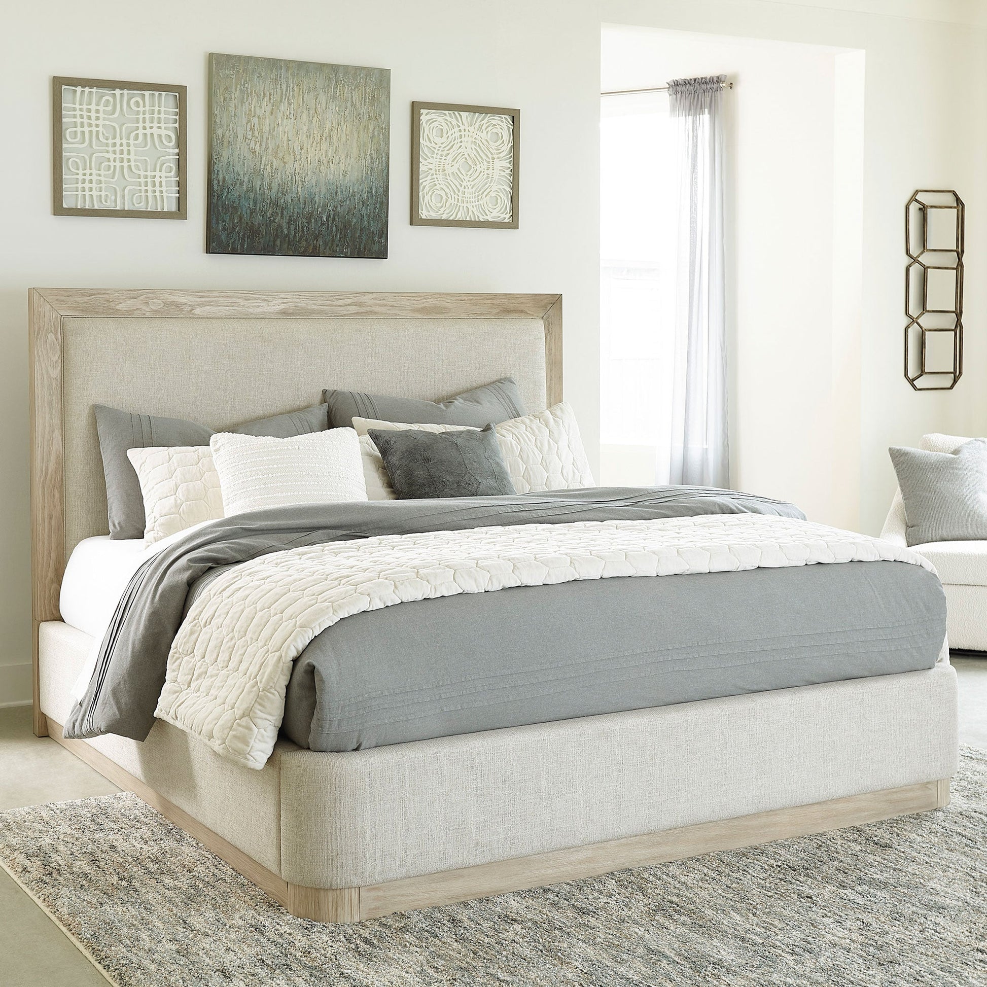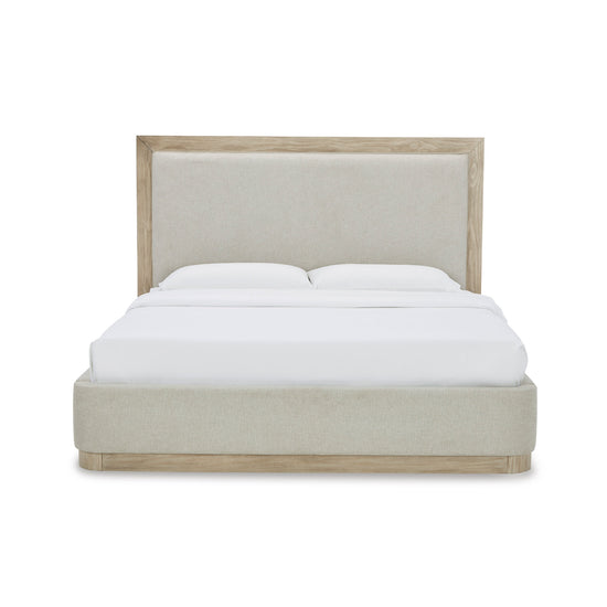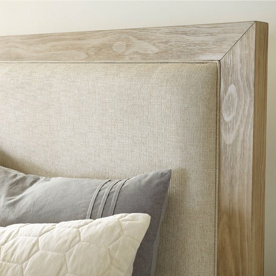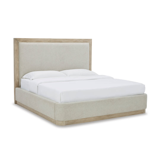 Get the luxe modern contemporary design you love at an affordable price. This upholstered panel bed features a structured silhouette on a plinth base that elevates the piece to a modern masterpiece. Soft yet still sleek in design, this bed's cushioned side rails and footboard have rounded ends. The textural surface of the bisque-colored wood pairs beautifully with the neutral upholstery.