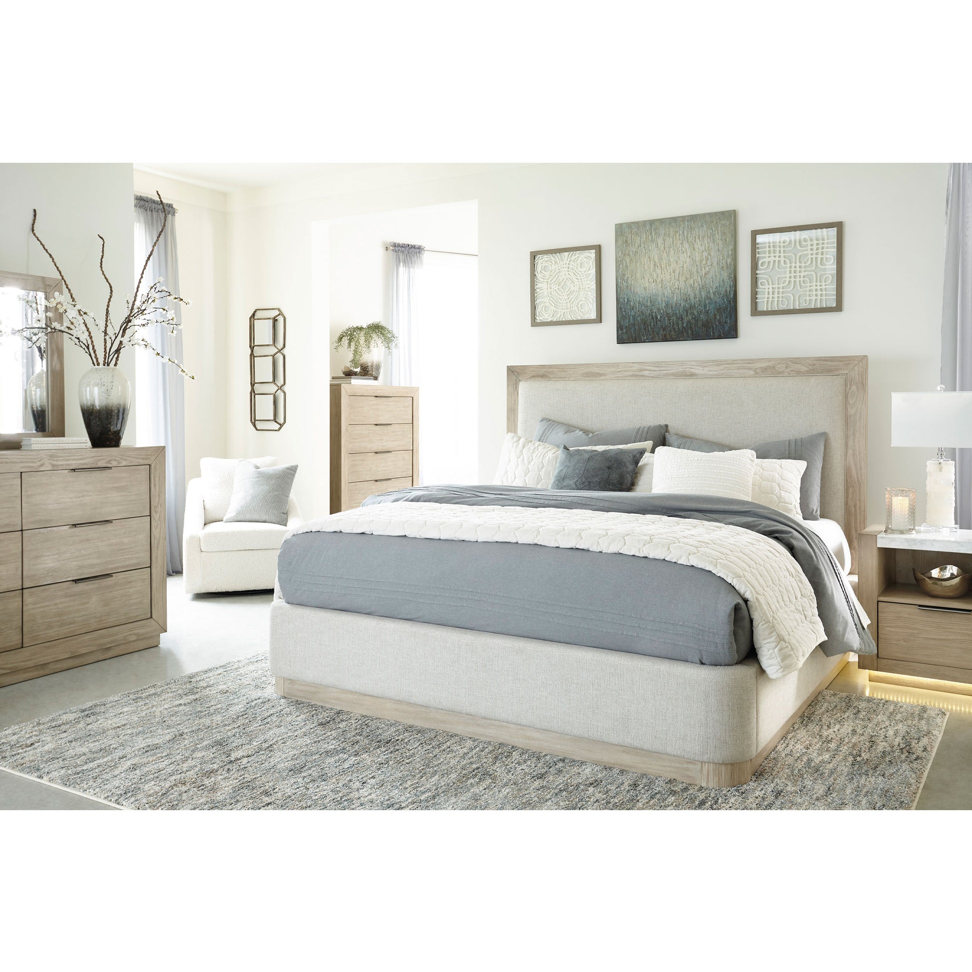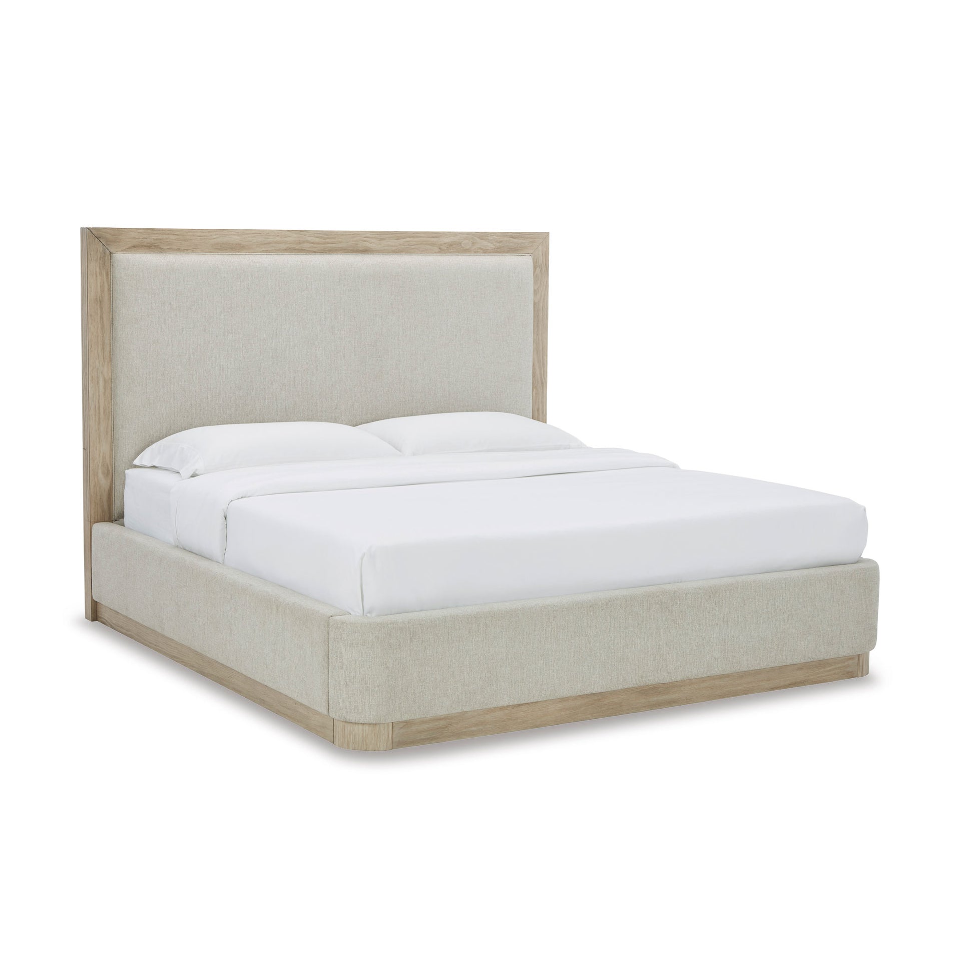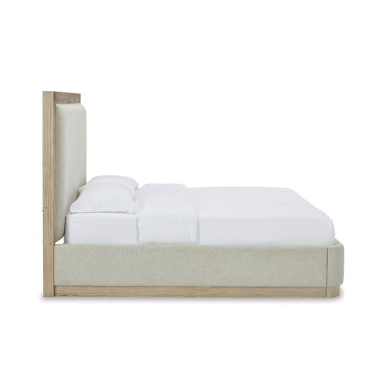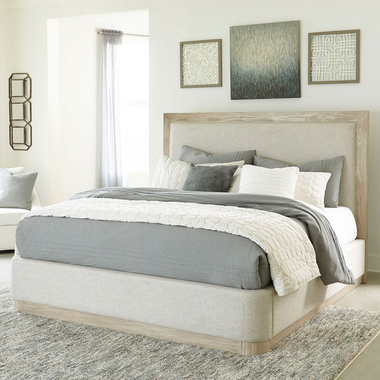 Modern luxury made approachable. The Hennington Bedroom Set brings sophisticated style with a sleek plinth base, wire-brushed bisque wood finish, and soft neutral upholstery.