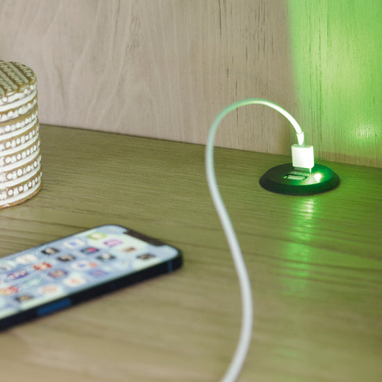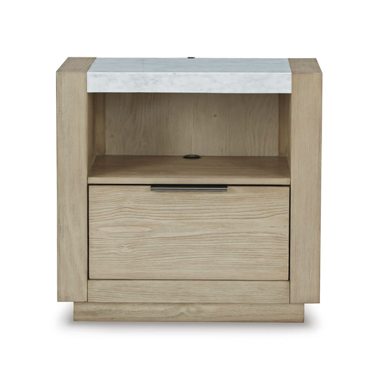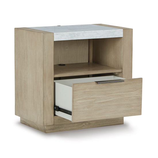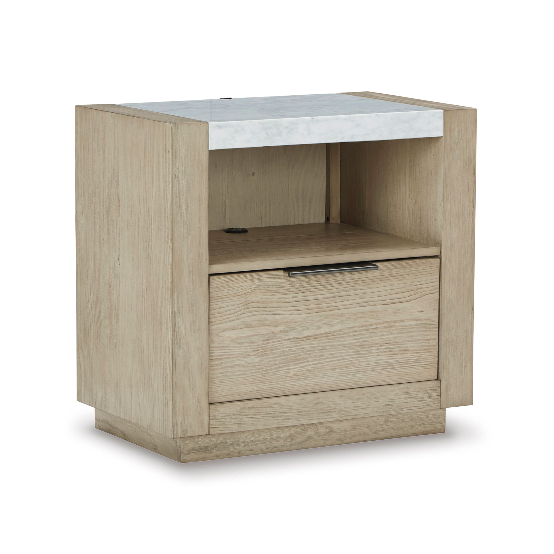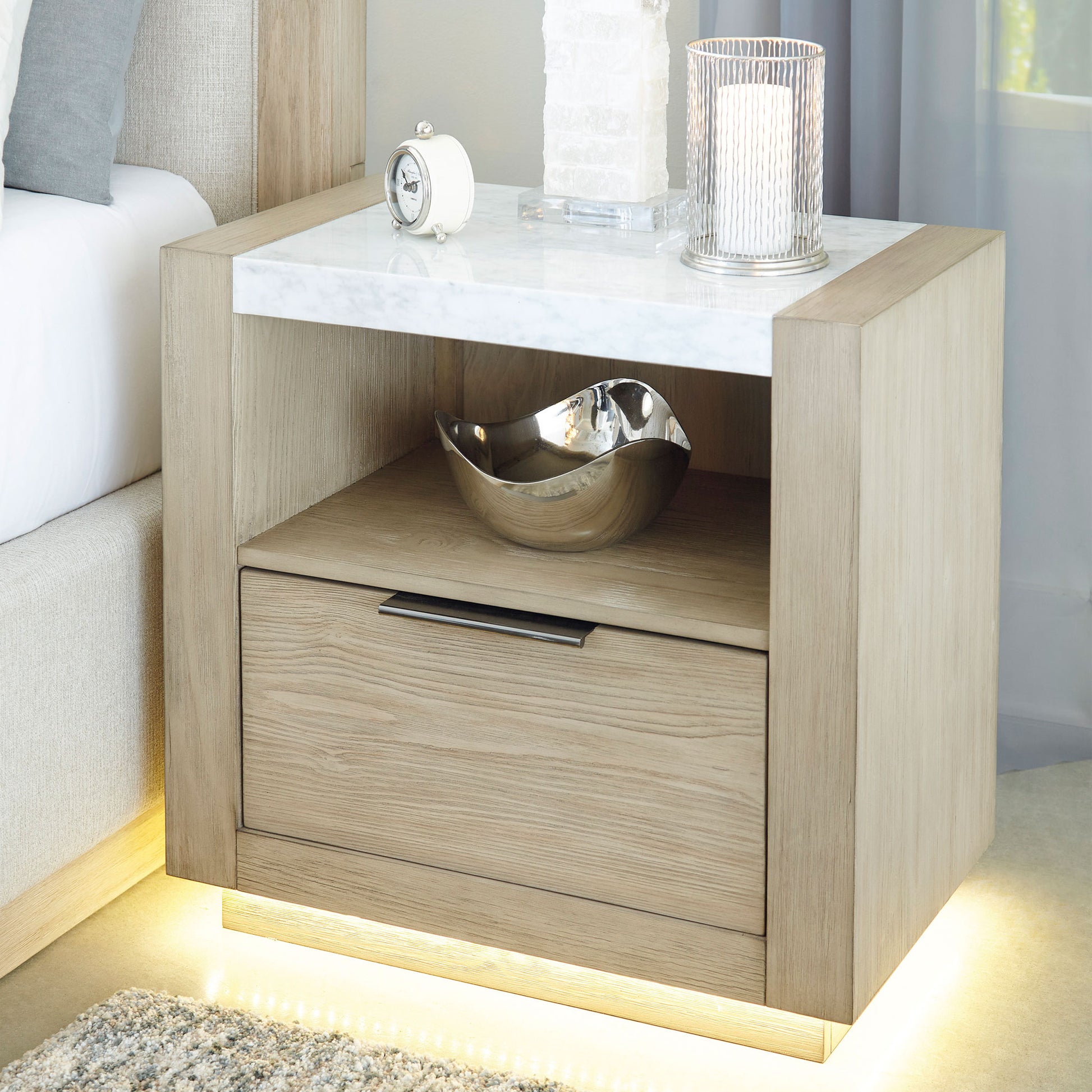 Marble top nightstand with open shelf, LED night light base, and USB charging ports