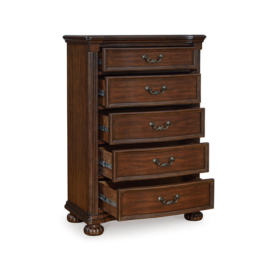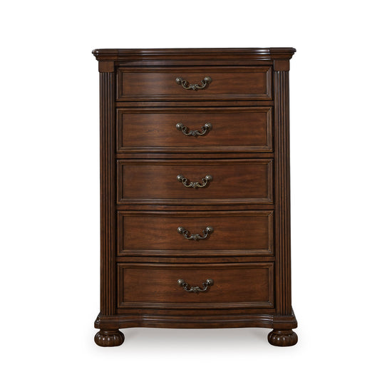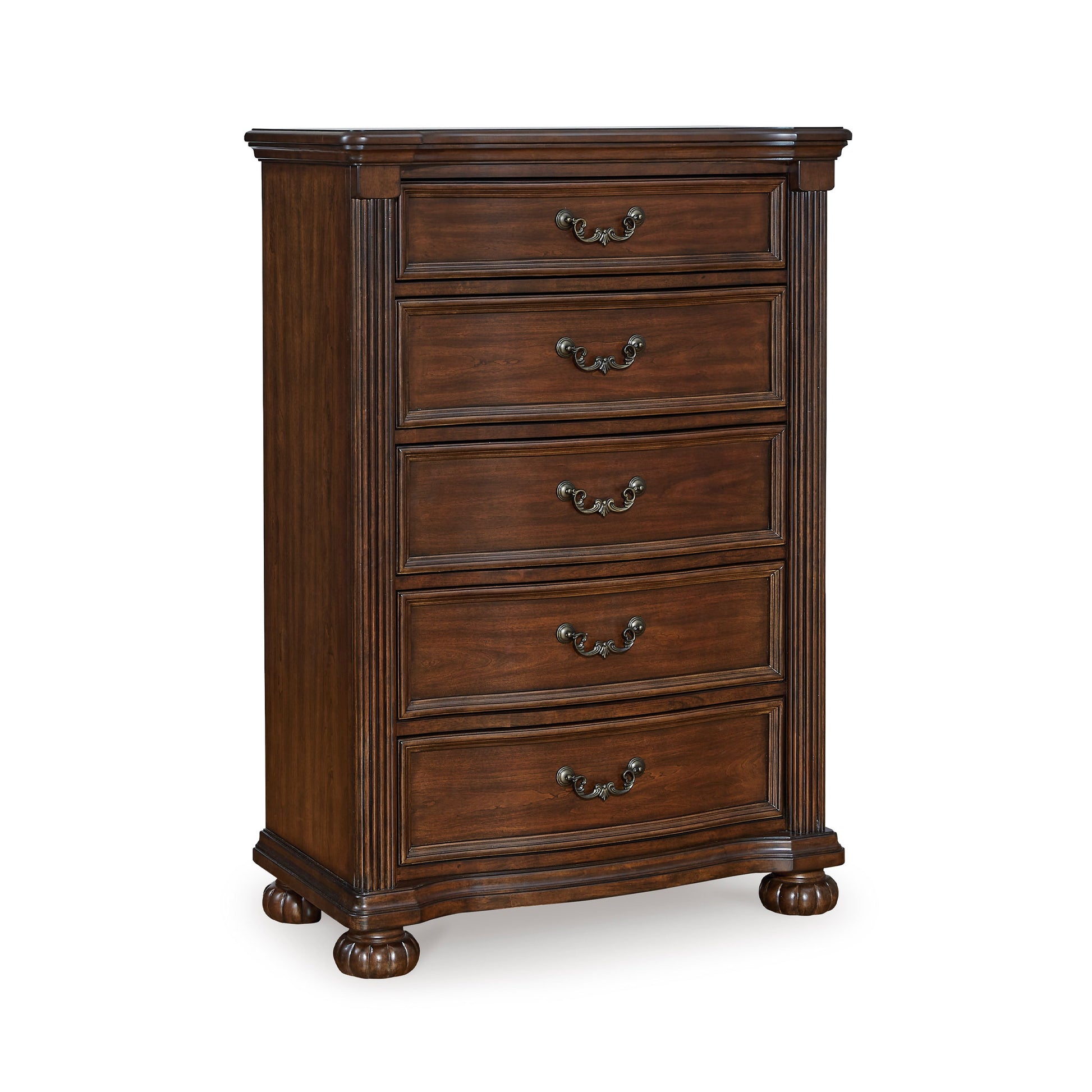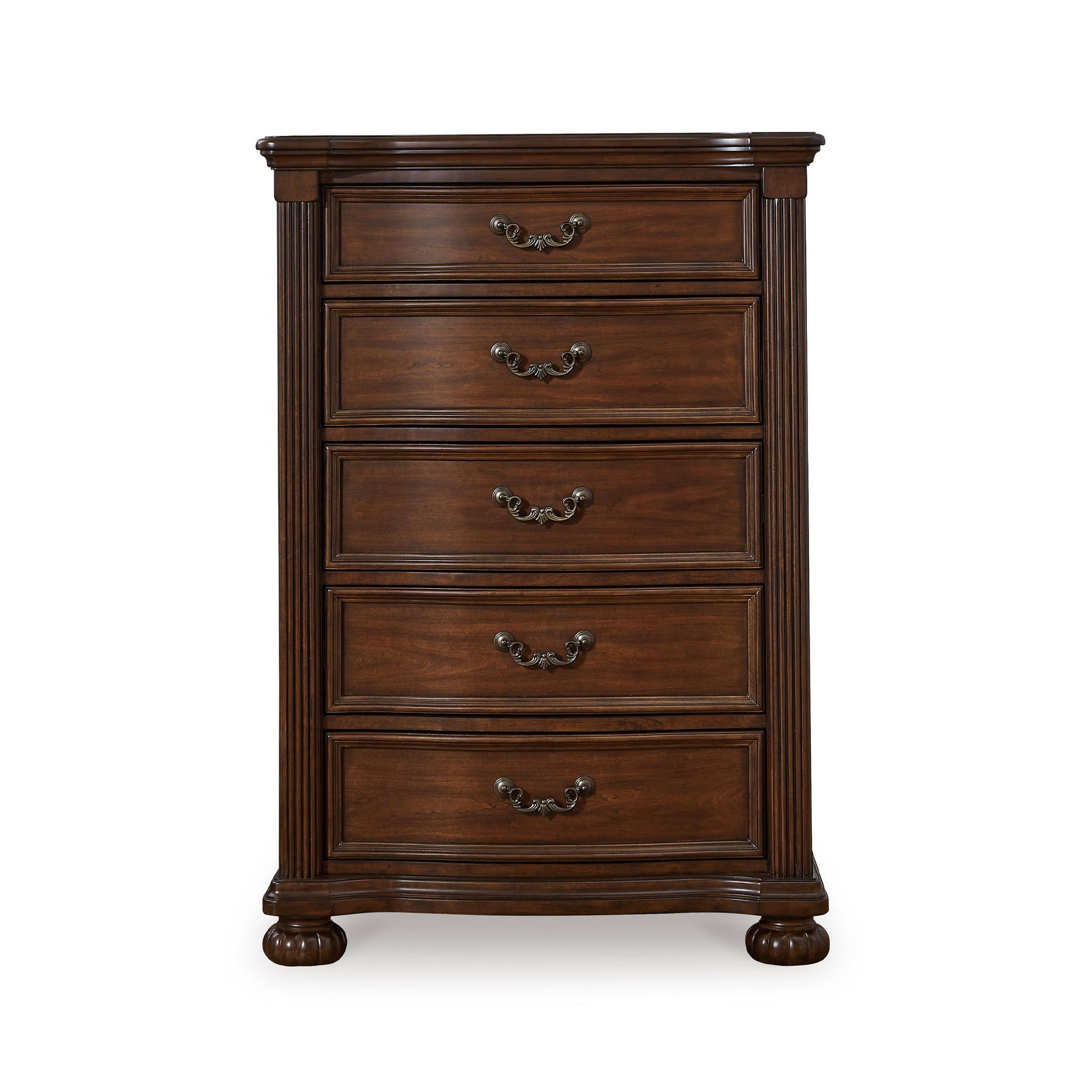 Take inspiration from the traditional luxury of this chest of drawers. Classic with a rich cherry brown finish, its stately presence graces your room with an air of opulence. Your taste for exquisite details is satisfied with decorative drawer pulls and chic bun feet. With five drawers acting as elegant hosts for clothes and other essentials, your restful retreat has never been so refined.