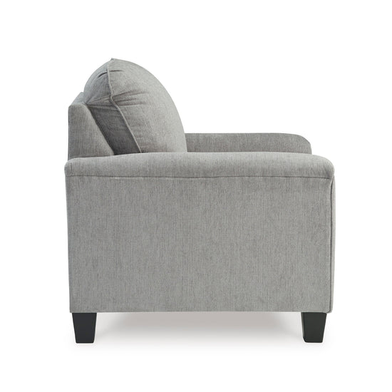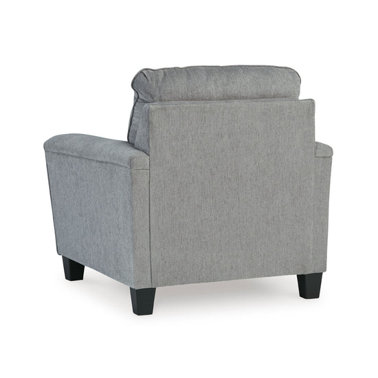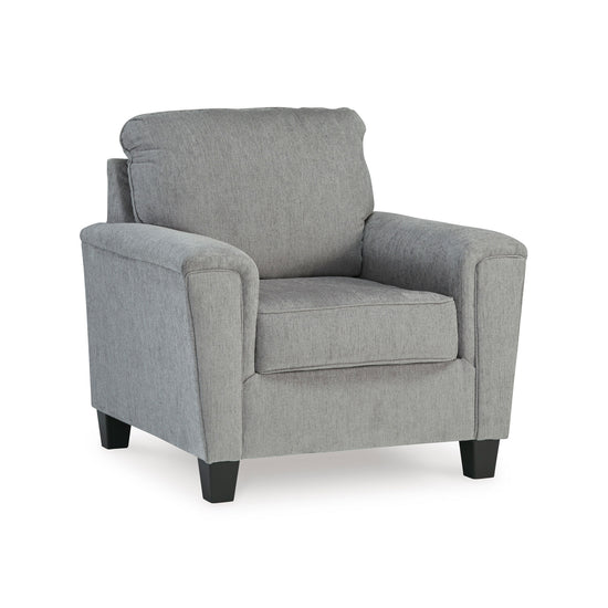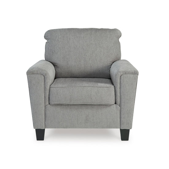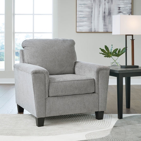 This accent chair offers an updated profile and contemporary design. Complete with padded arms and welted cushions in a versatile light gray color, this piece seamlessly complements various interiors. With its stylish design and cozy feel, it's ideal for relaxation and entertainment.