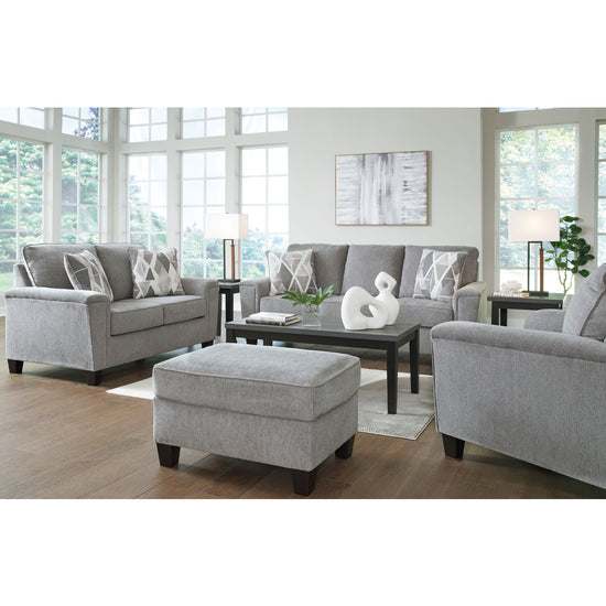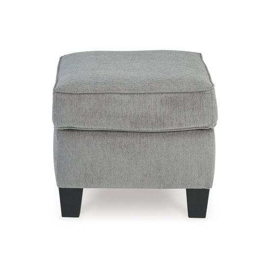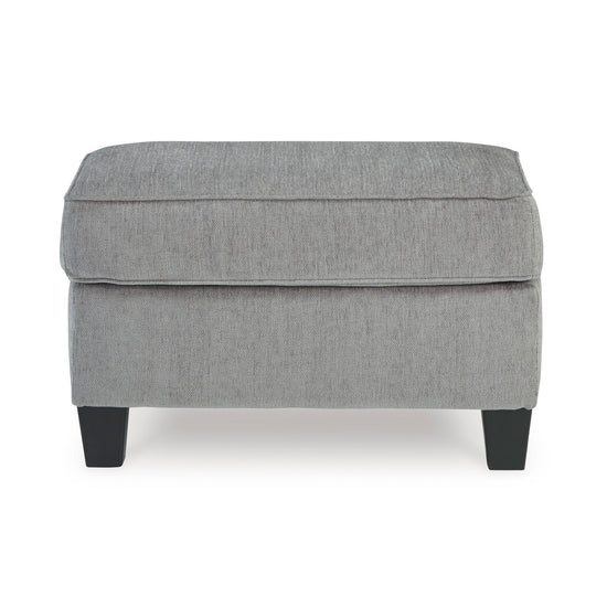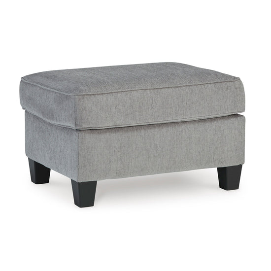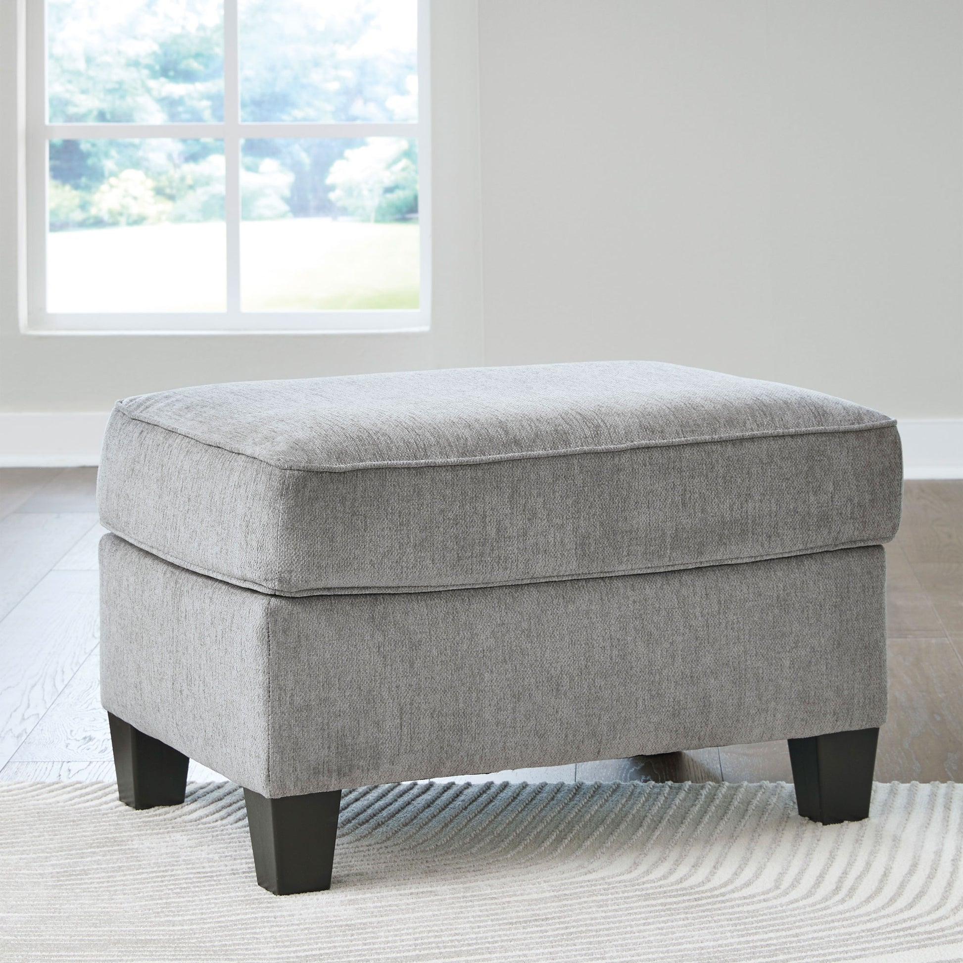 This ottoman offers an updated profile and contemporary design. Complete with a padded frame and welted cushion in a versatile light gray color, this piece seamlessly complements various interiors. With its stylish design and cozy feel, it's ideal for relaxing after a long day.