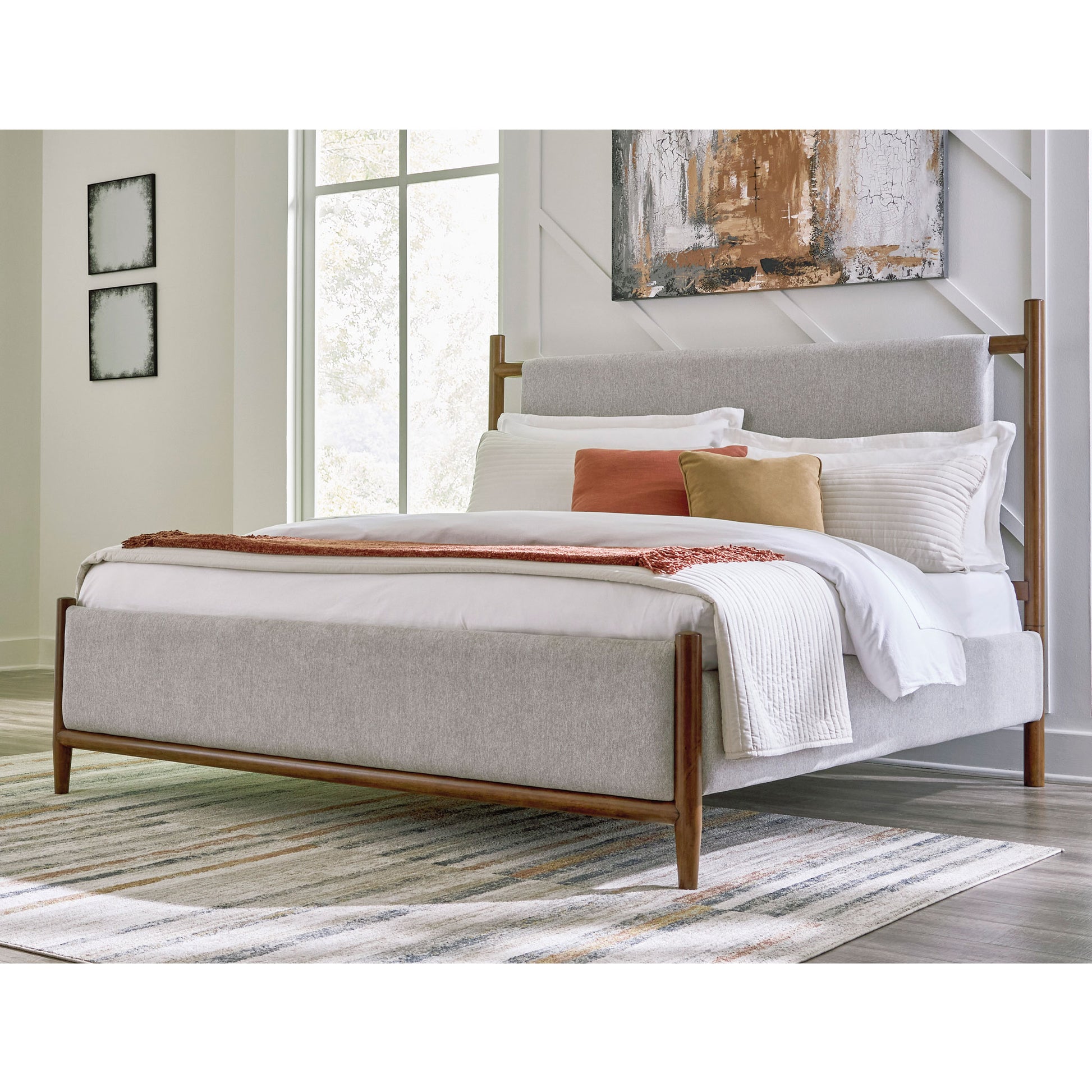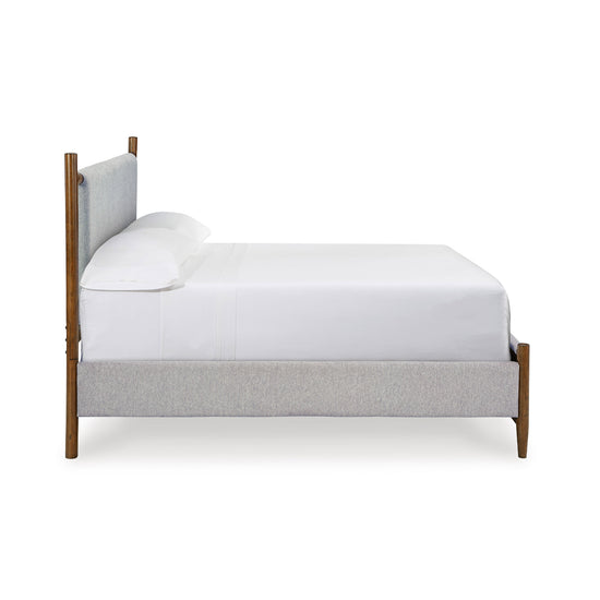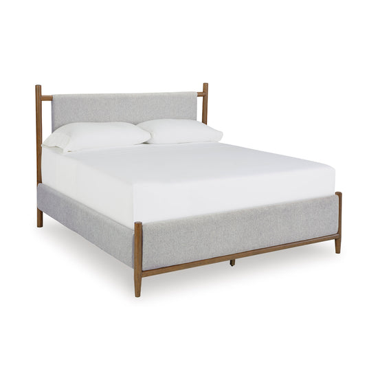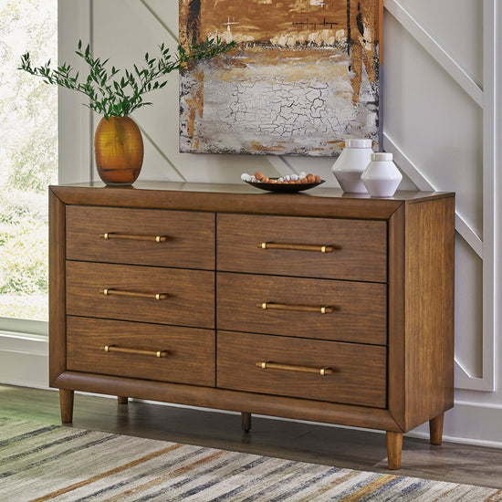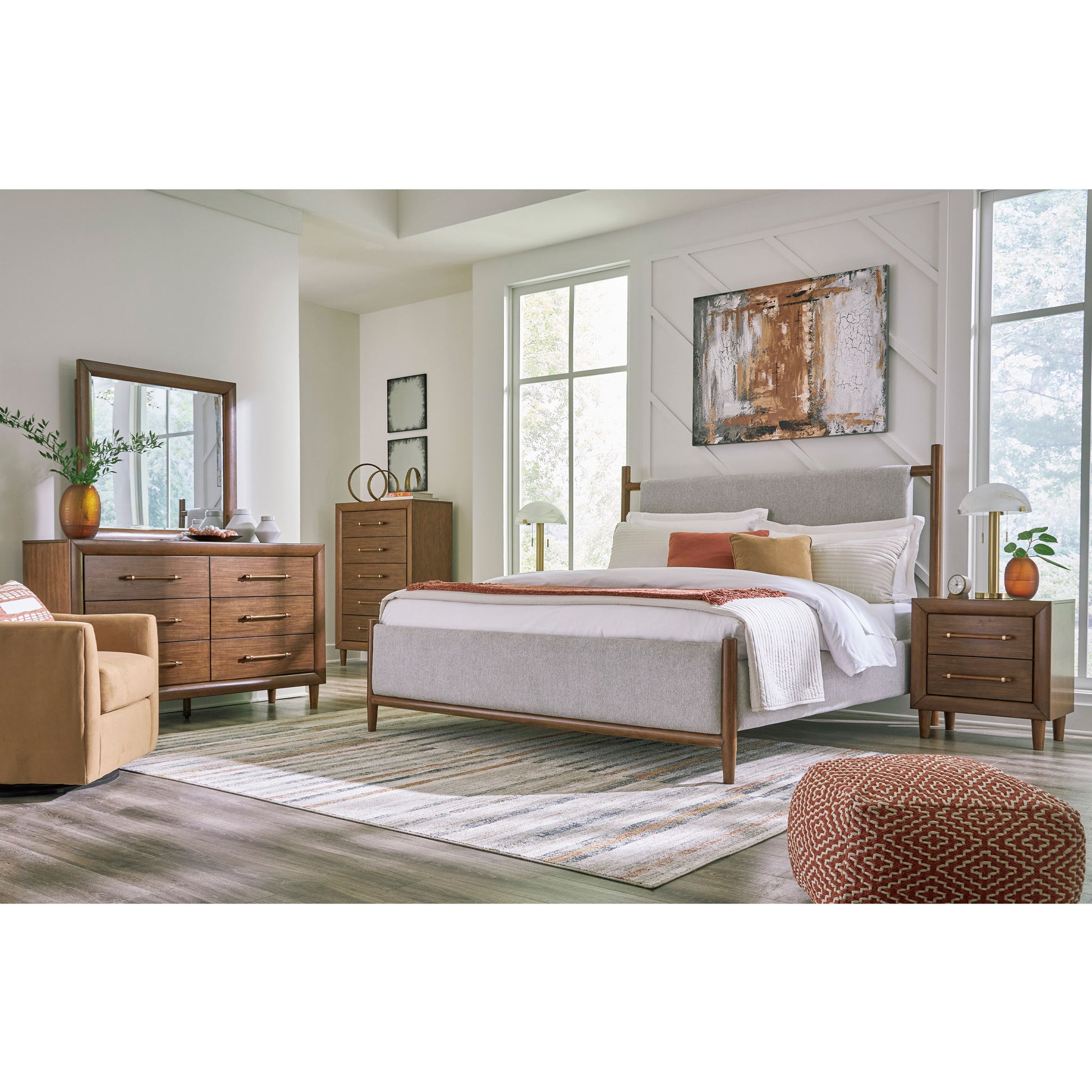 Mid-century inspiration meets modern functionality in the Lyncott Bedroom Set. With its clean lines, rich wood tones, and refined details, this set brings a sense of warmth and timeless sophistication to your space. From the upholstered panel bed with its sling-style headboard to the streamlined storage pieces, Lyncott offers a cohesive look designed to refresh your bedroom retreat.