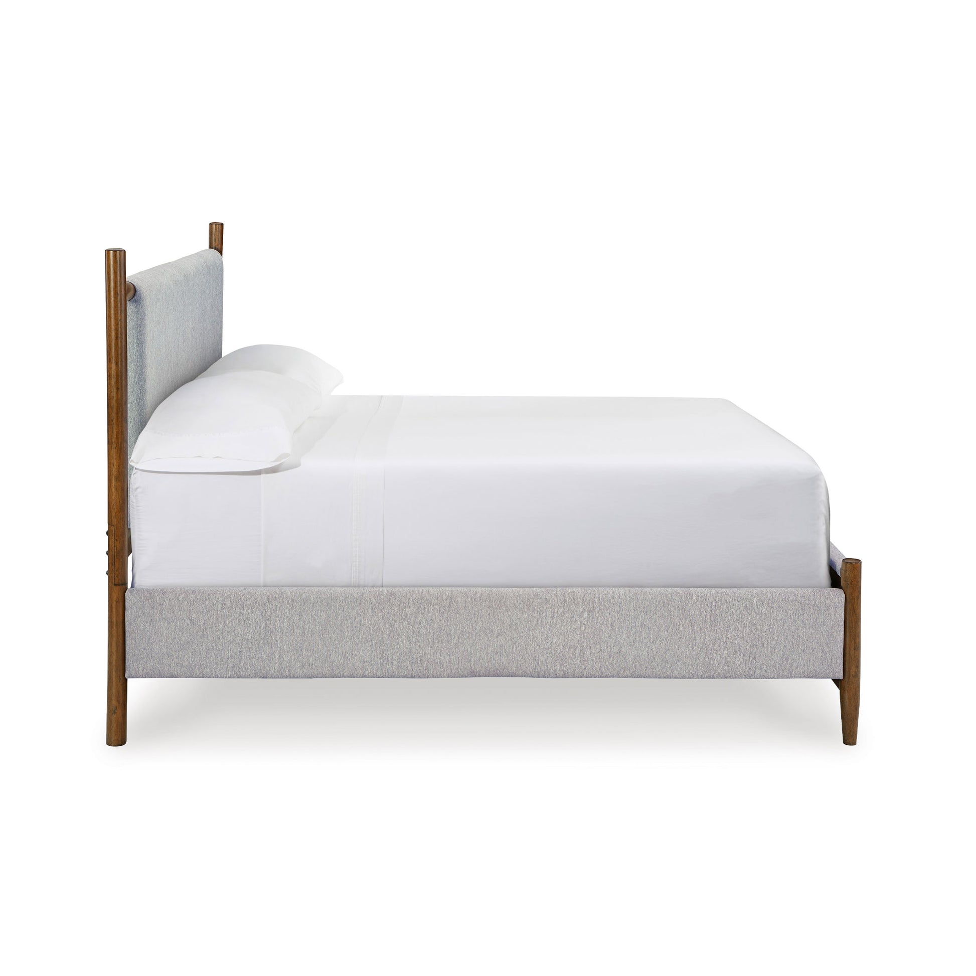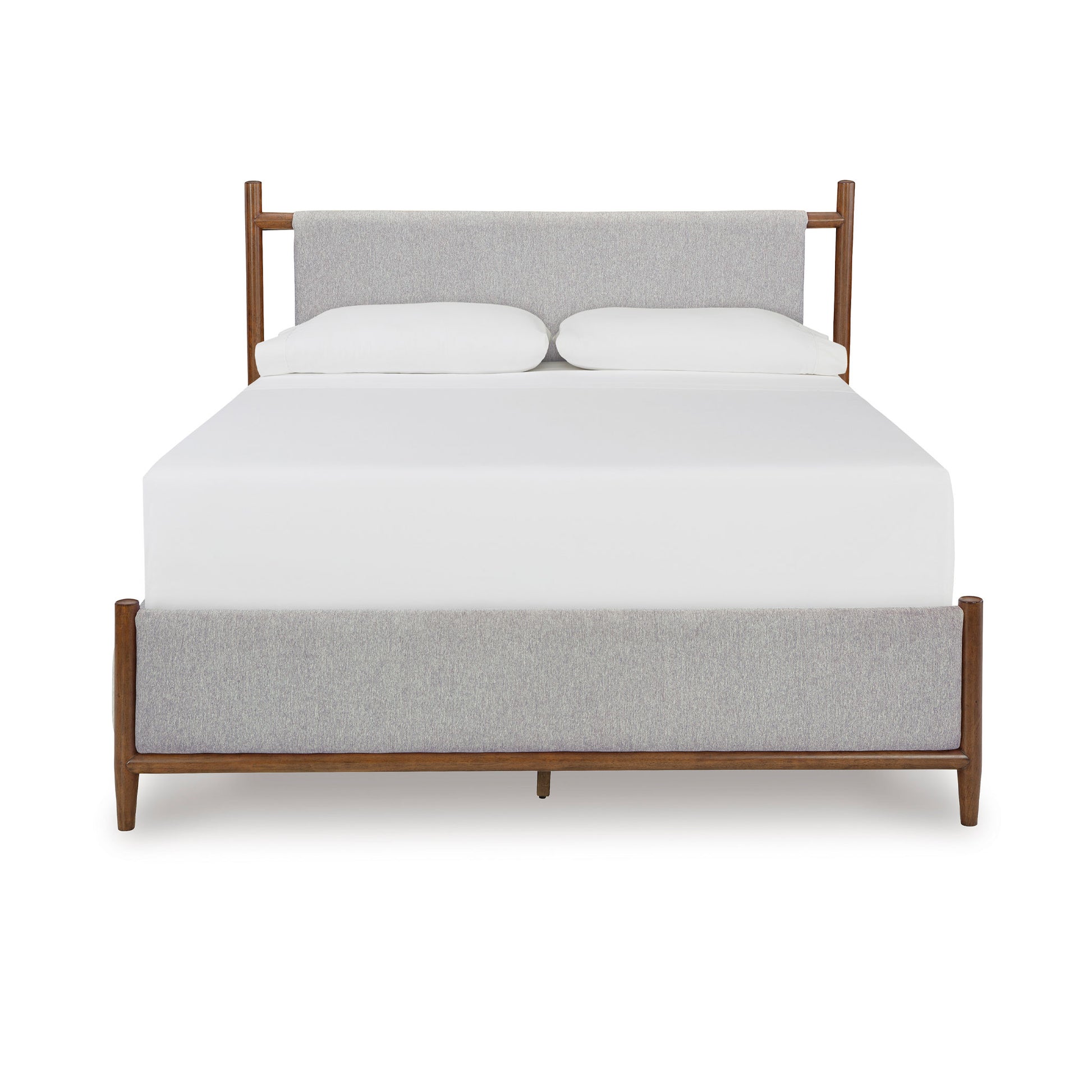 Bed features a solid wood frame with a medium brown wood-tone finish and a sling-style cushioned headboard upholstered in soft polyester