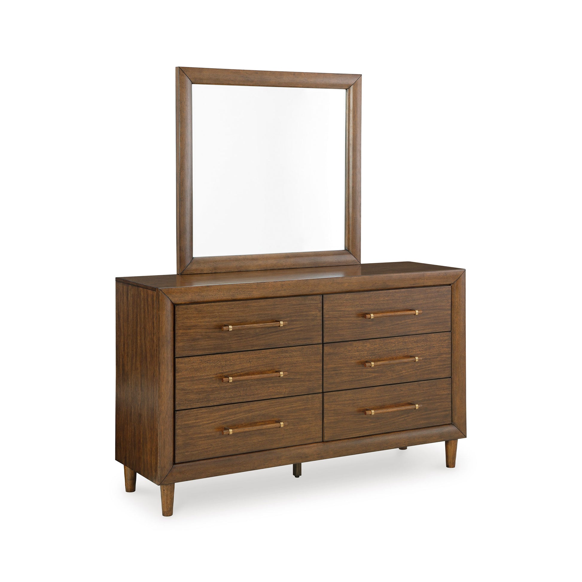 Elongated wooden drawer pulls and exquisite framing detail enhance the dresser's sleek aesthetic