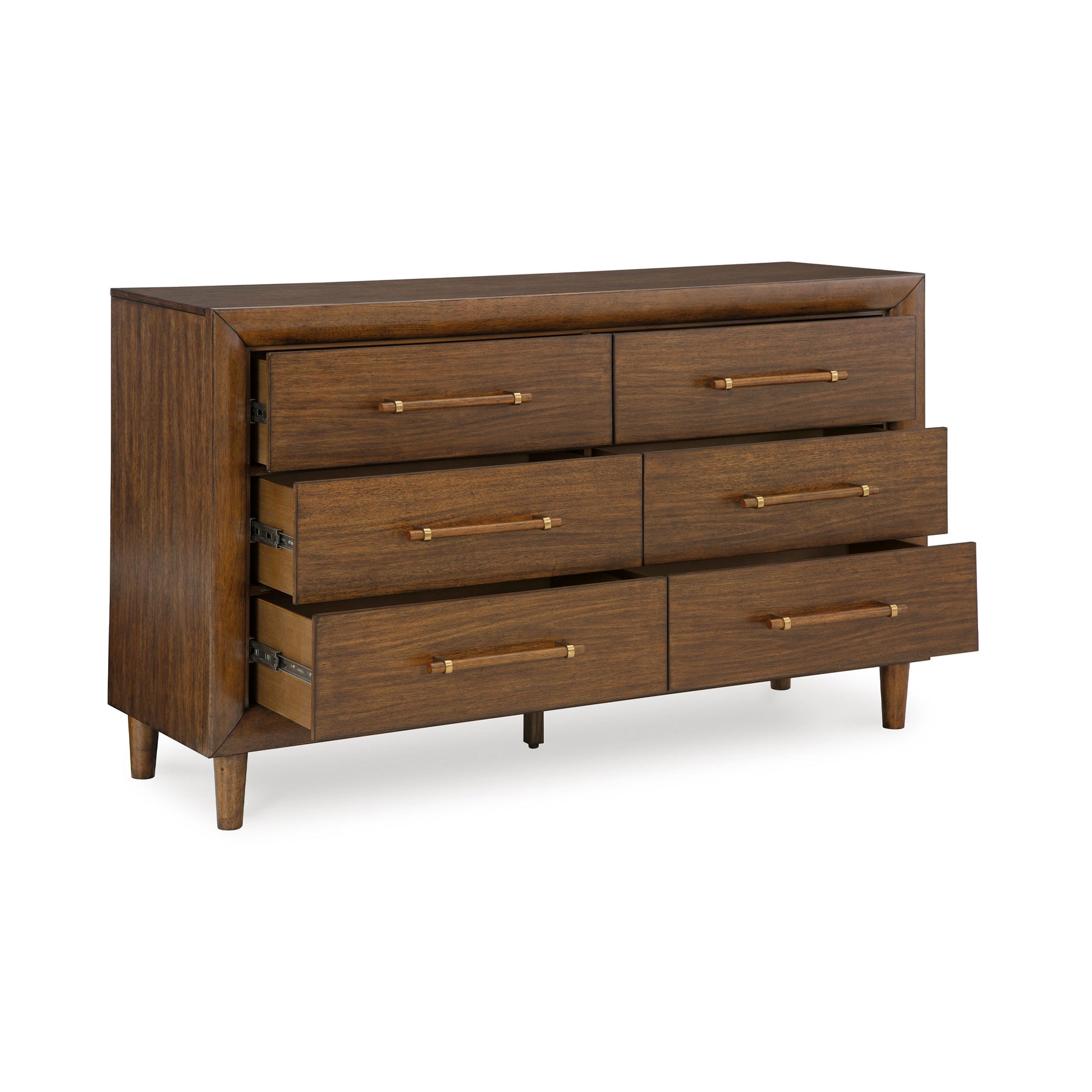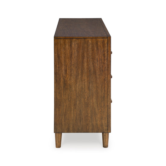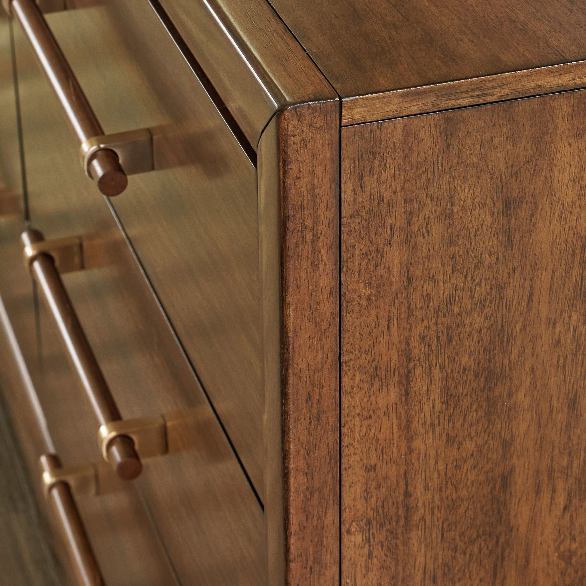 This dresser is perfect for contemporary or mid-century interiors. Its wood-tone finish is versatile and timeless. The drawers, designed with exquisite framing and elongated wooden pulls, enhance the overall aesthetic. Whether you want to refresh your entire bedroom or add a few key pieces, this is the ideal choice.