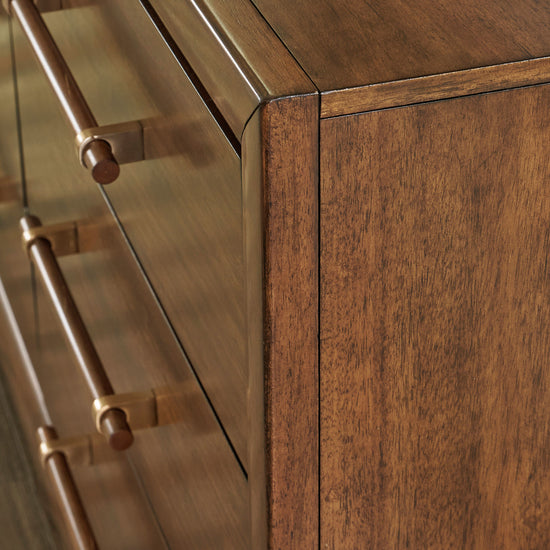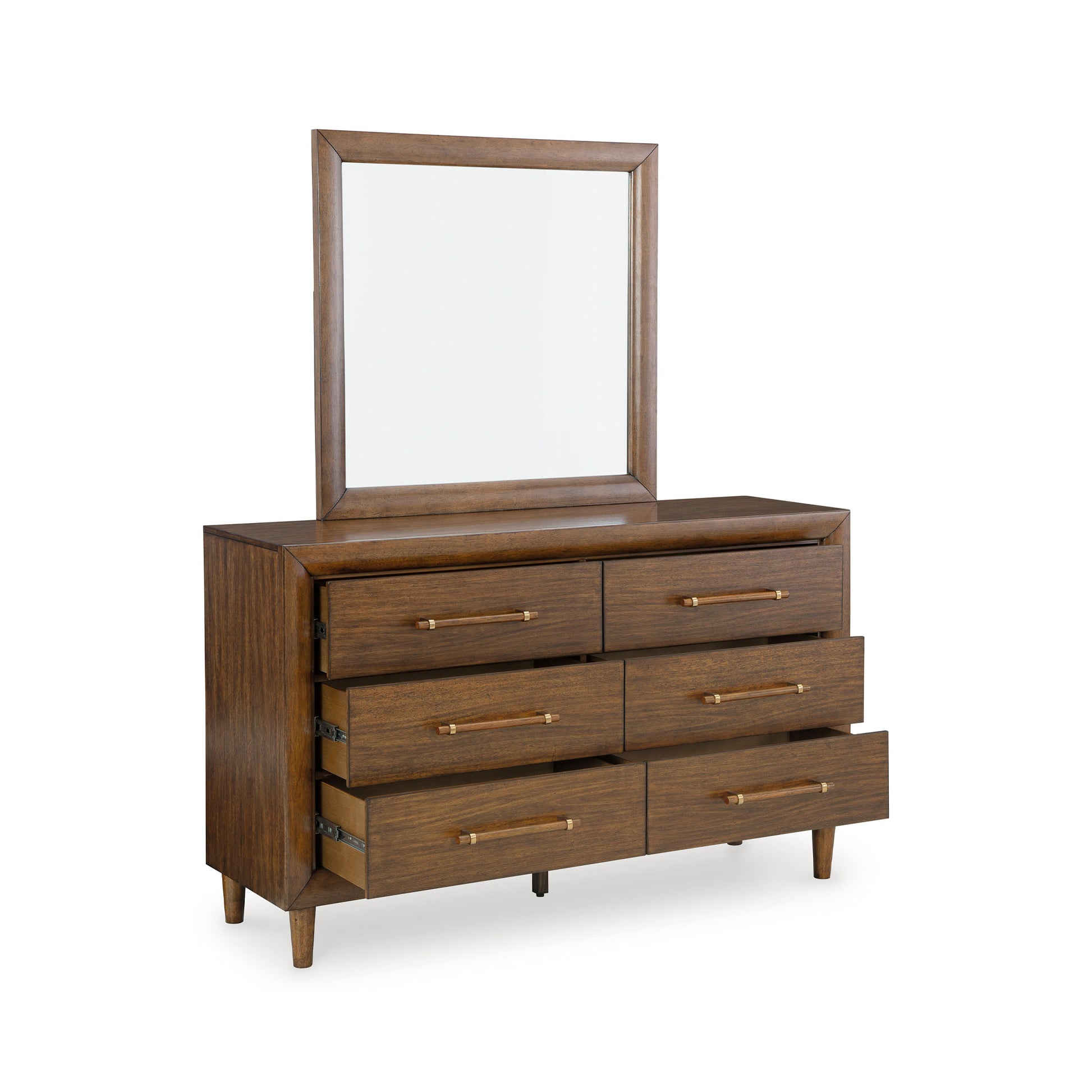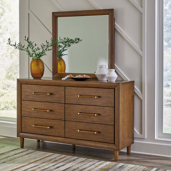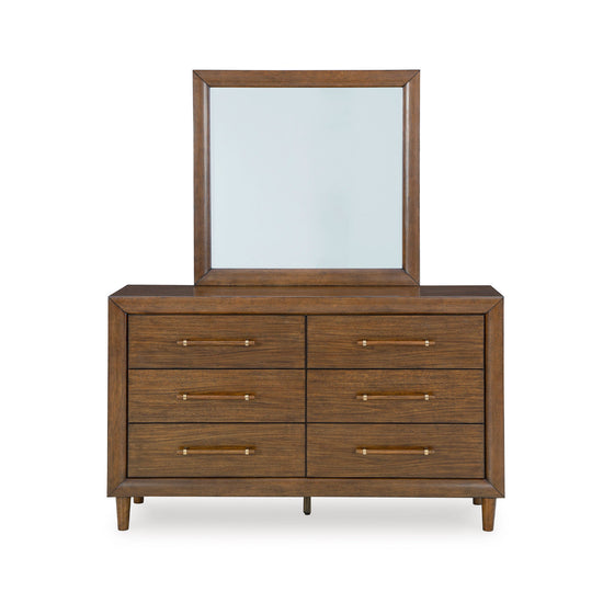 This dresser with mirror is perfect for contemporary or mid-century interiors. Its wood-tone finish is versatile and timeless. The drawers, designed with exquisite framing and elongated wooden pulls, enhance the overall aesthetic. Whether you want to refresh your entire bedroom or add a few key pieces, this is the ideal choice.