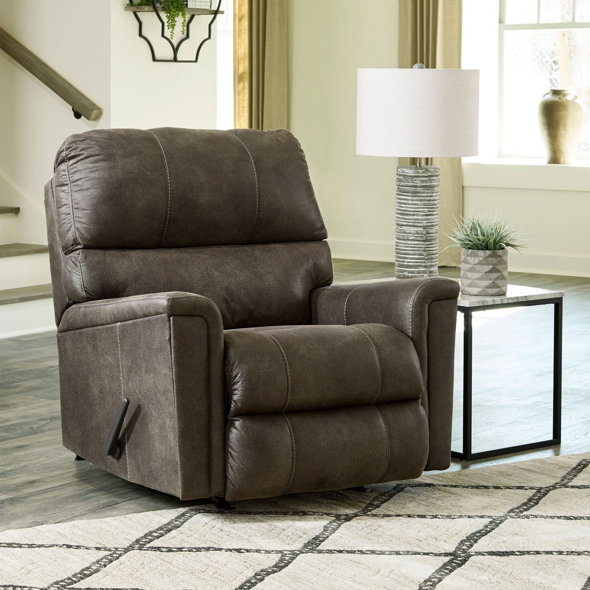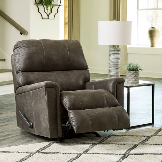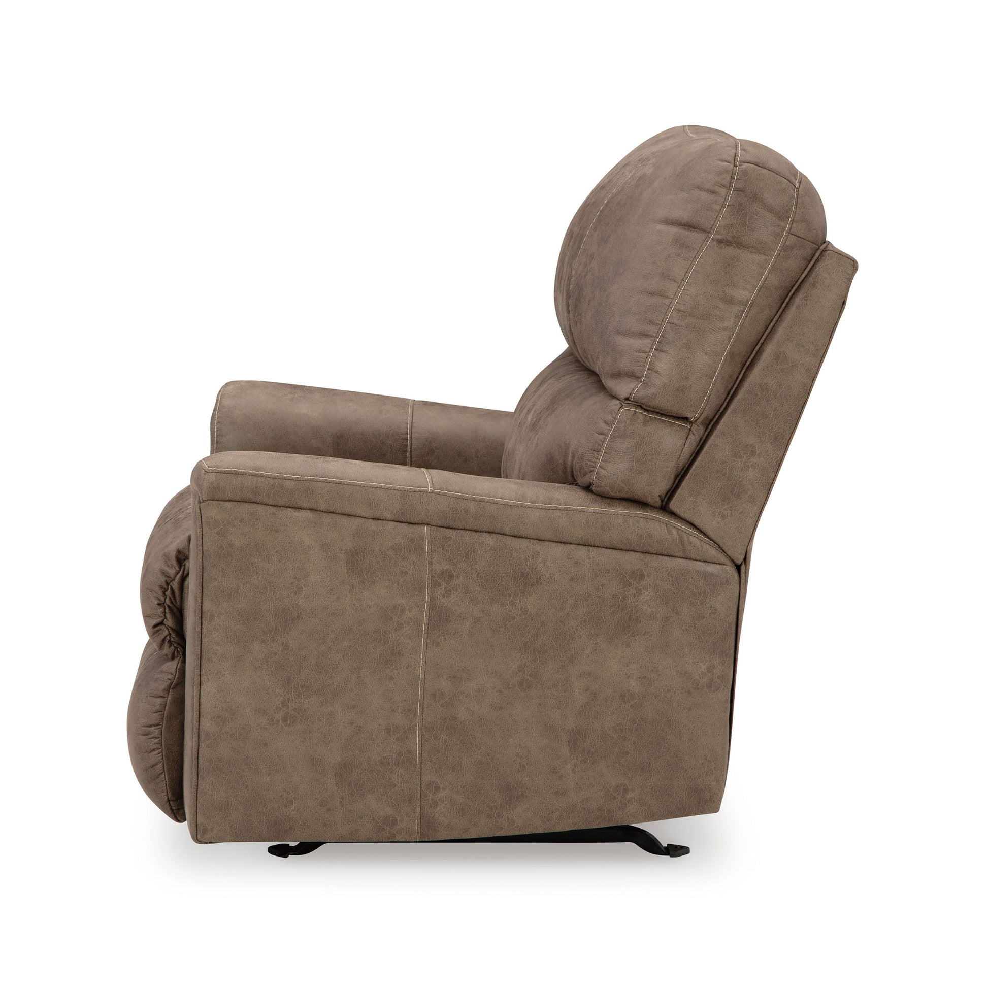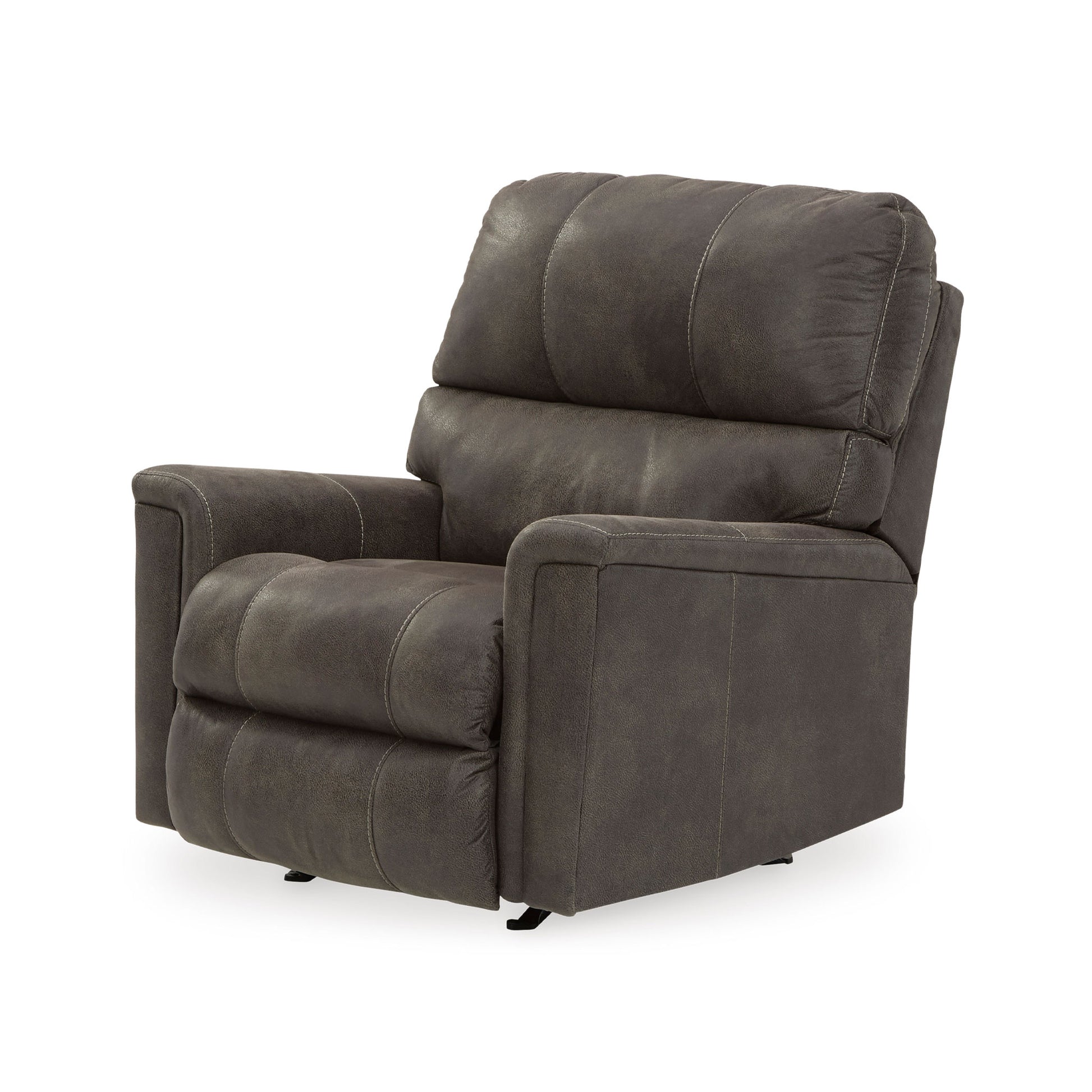 If you love the cool look of leather but long for the warm feel of fabric, you can take comfort in this rocker recliner. Wrapped in a fabulous faux leather with a weathered hue and hint of pebbly texture to resemble the real deal, this decidedly modern recliner proves less is more. Elements include angled side profiling and track armrests wrapped with a layer of pillowy softness for that little something extra. Prominent jumbo stitching and clean-lined divided back styling lend fashion-forward flair.