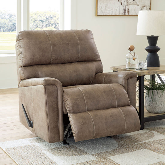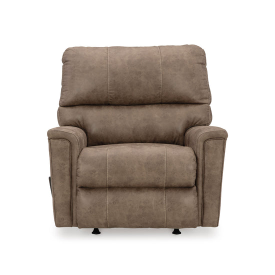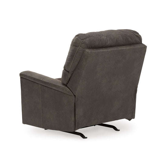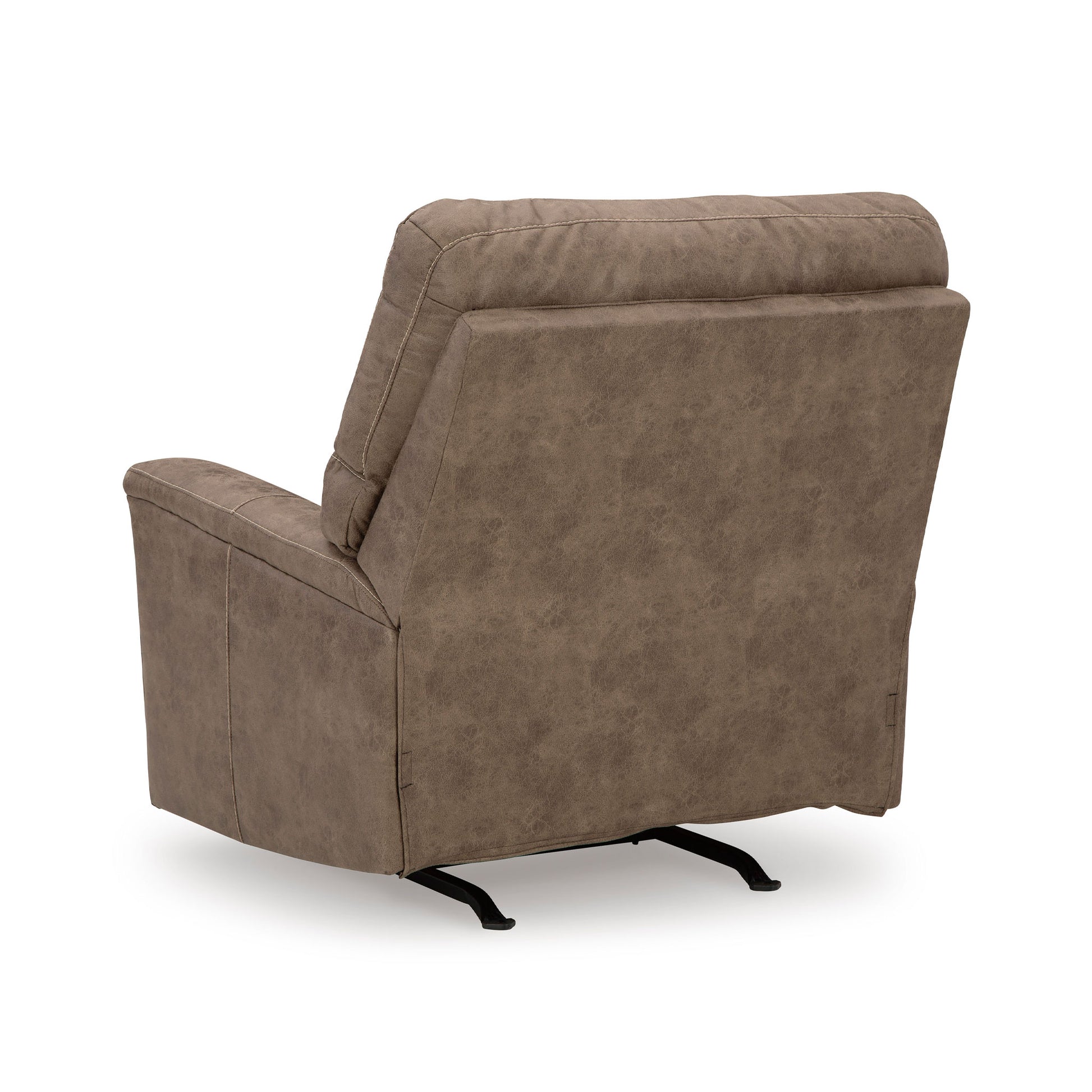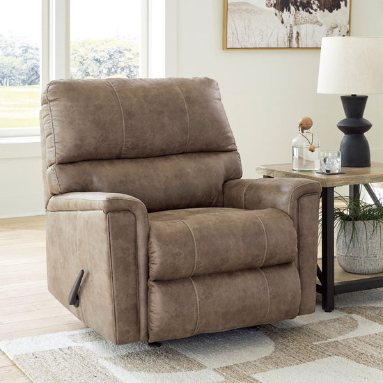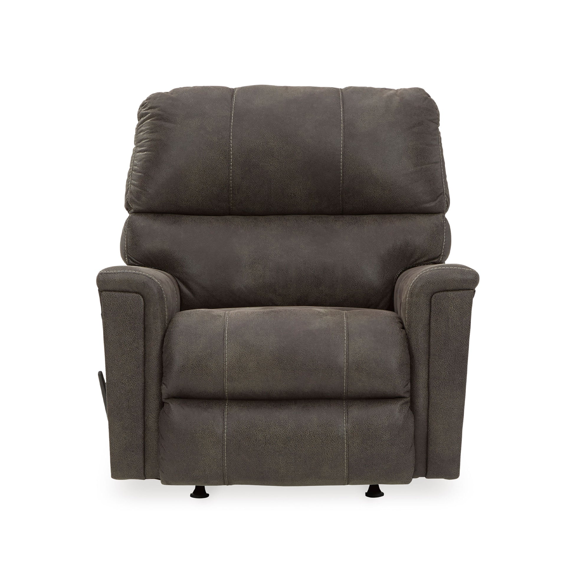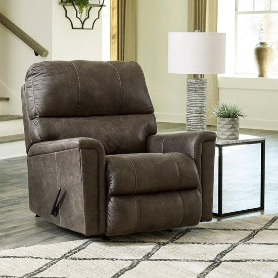 If you love the cool look of leather but long for the warm feel of fabric, you can take comfort in this rocker recliner. Wrapped in a fabulous faux leather with a weathered hue and hint of pebbly texture to resemble the real deal, this decidedly modern recliner proves less is more. Elements include angled side profiling and track armrests wrapped with a layer of pillowy softness for that little something extra. Prominent jumbo stitching and clean-lined divided back styling lend fashion-forward flair.