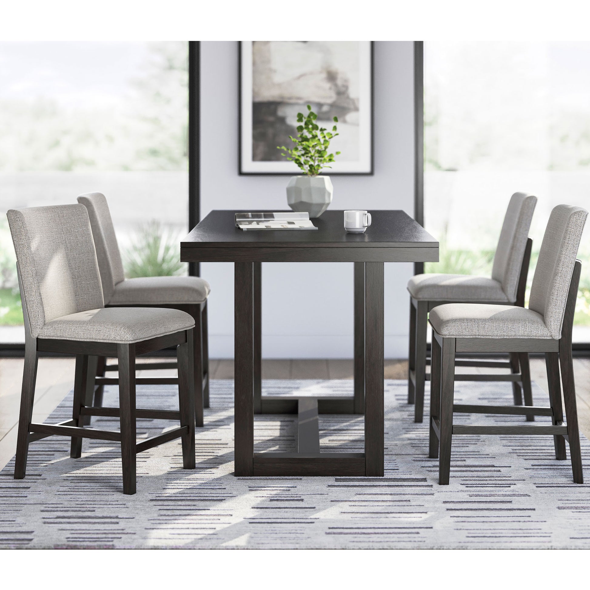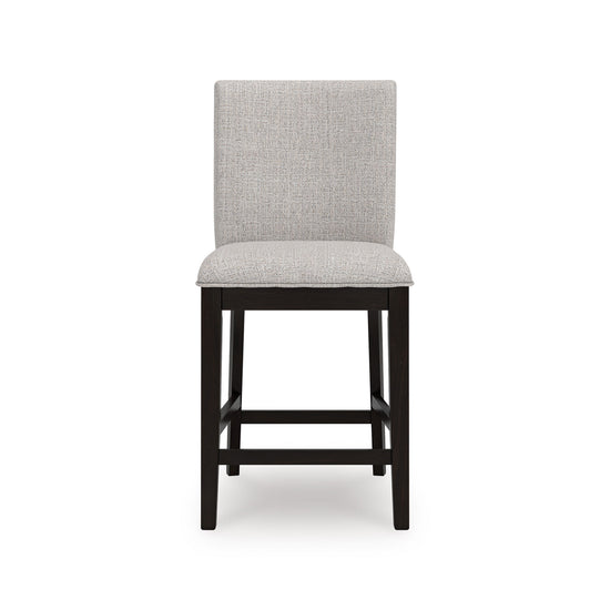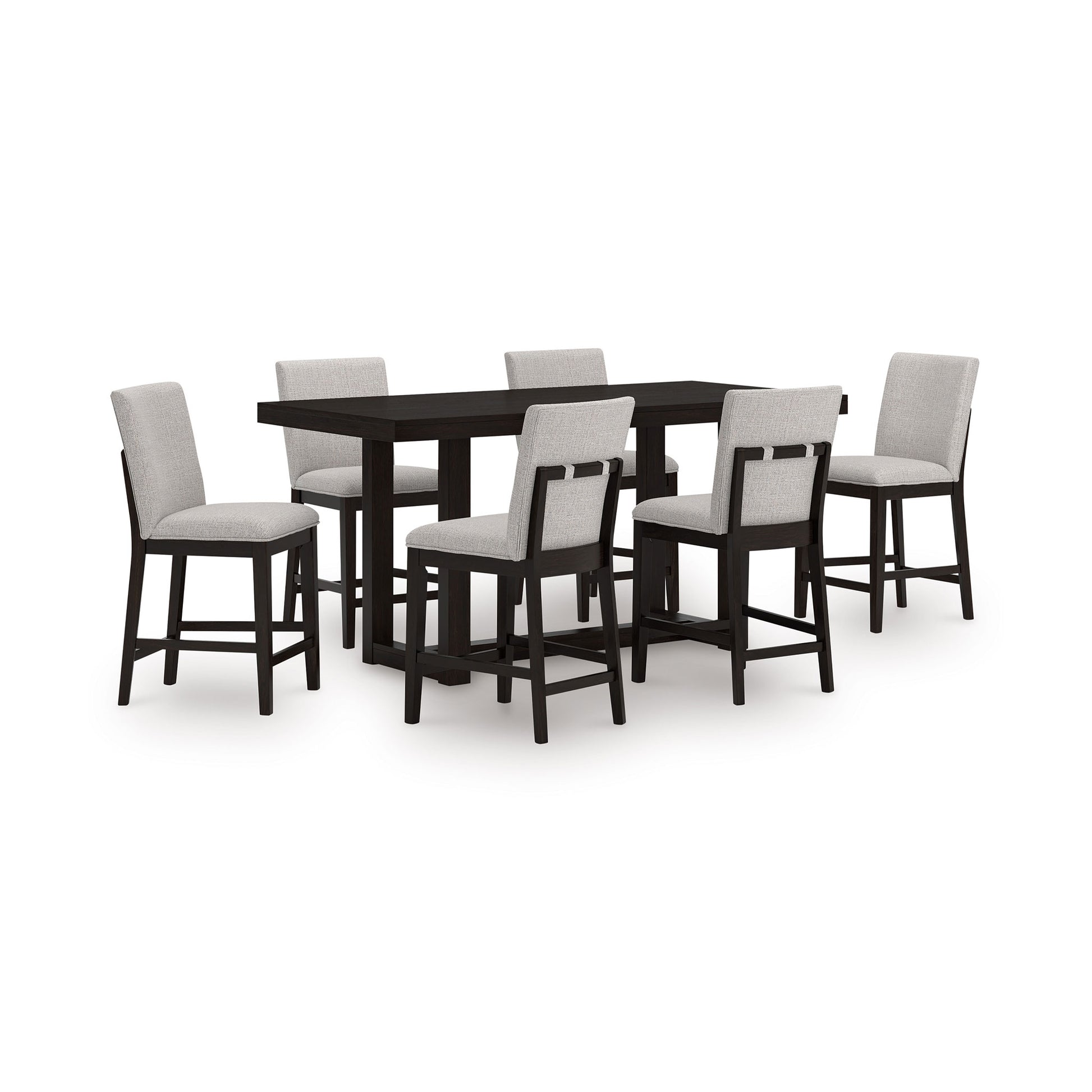 A seamless blend of casual comfort and contemporary style. The Neymorton 7-Piece Counter Dining Set makes everyday dining feel effortlessly elevated. Its counter-height table features a substantial top in a dark grayish brown finish, setting a refined yet inviting tone. Coordinating bar stools echo the look with matching wood tones and soft, stain-resistant Next-Gen Nuvella™ upholstery — offering the perfect balance of durability, easy care, and modern sophistication. Designed for both flair and function, this set invites you to gather in style.
