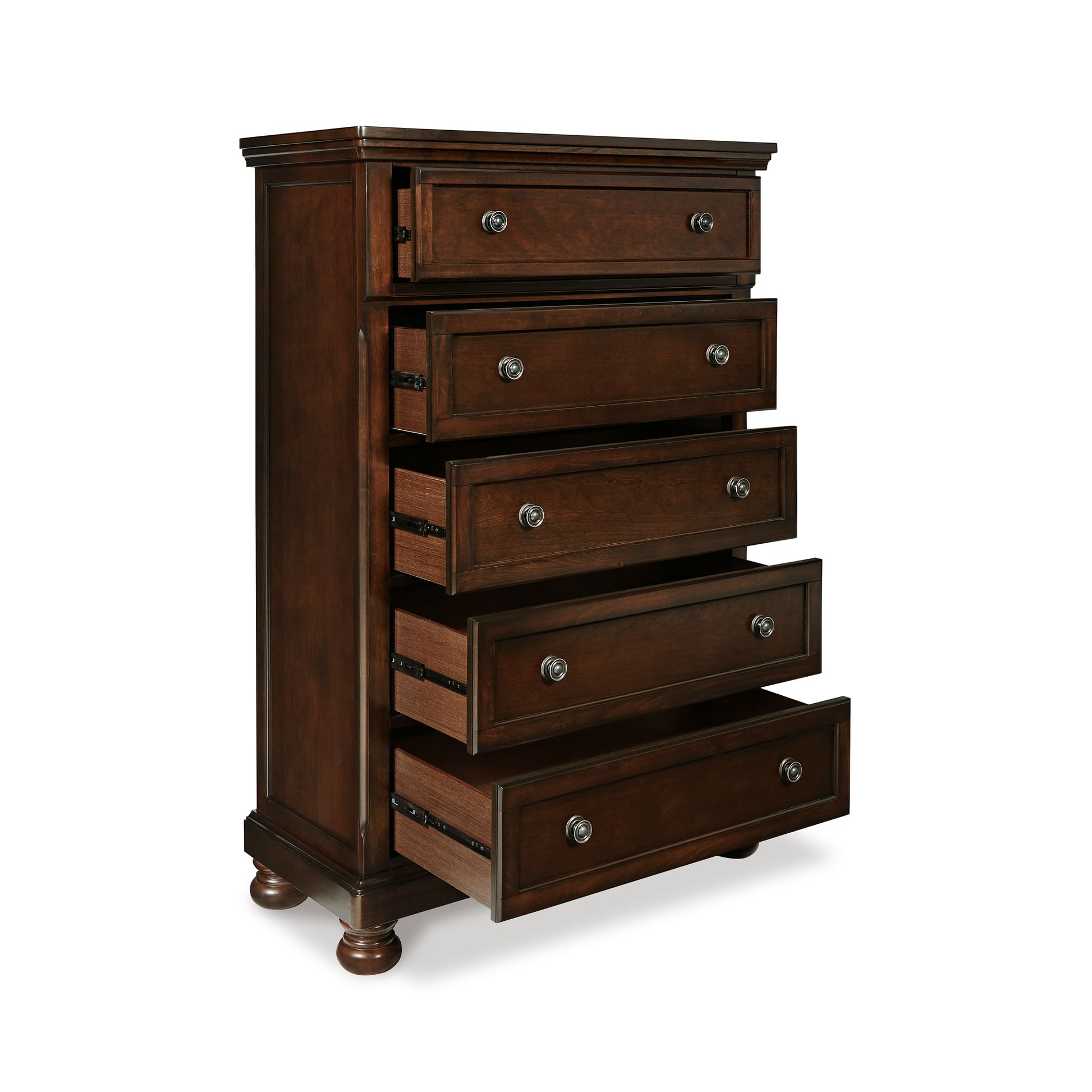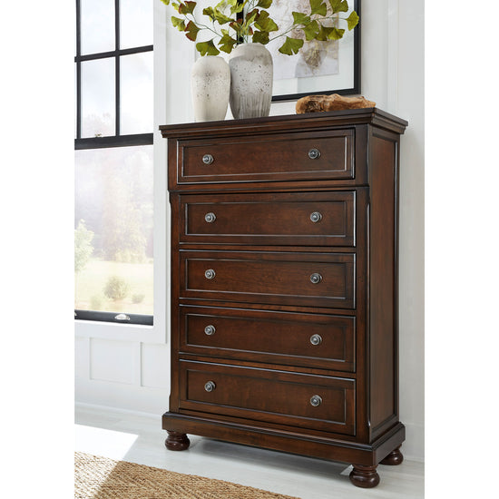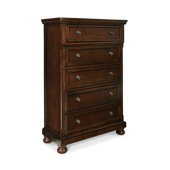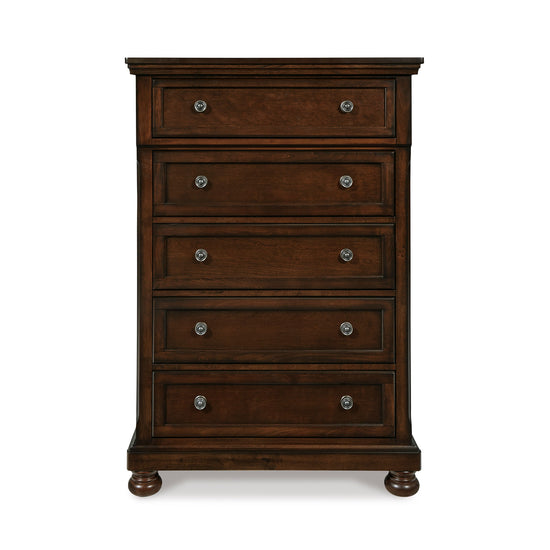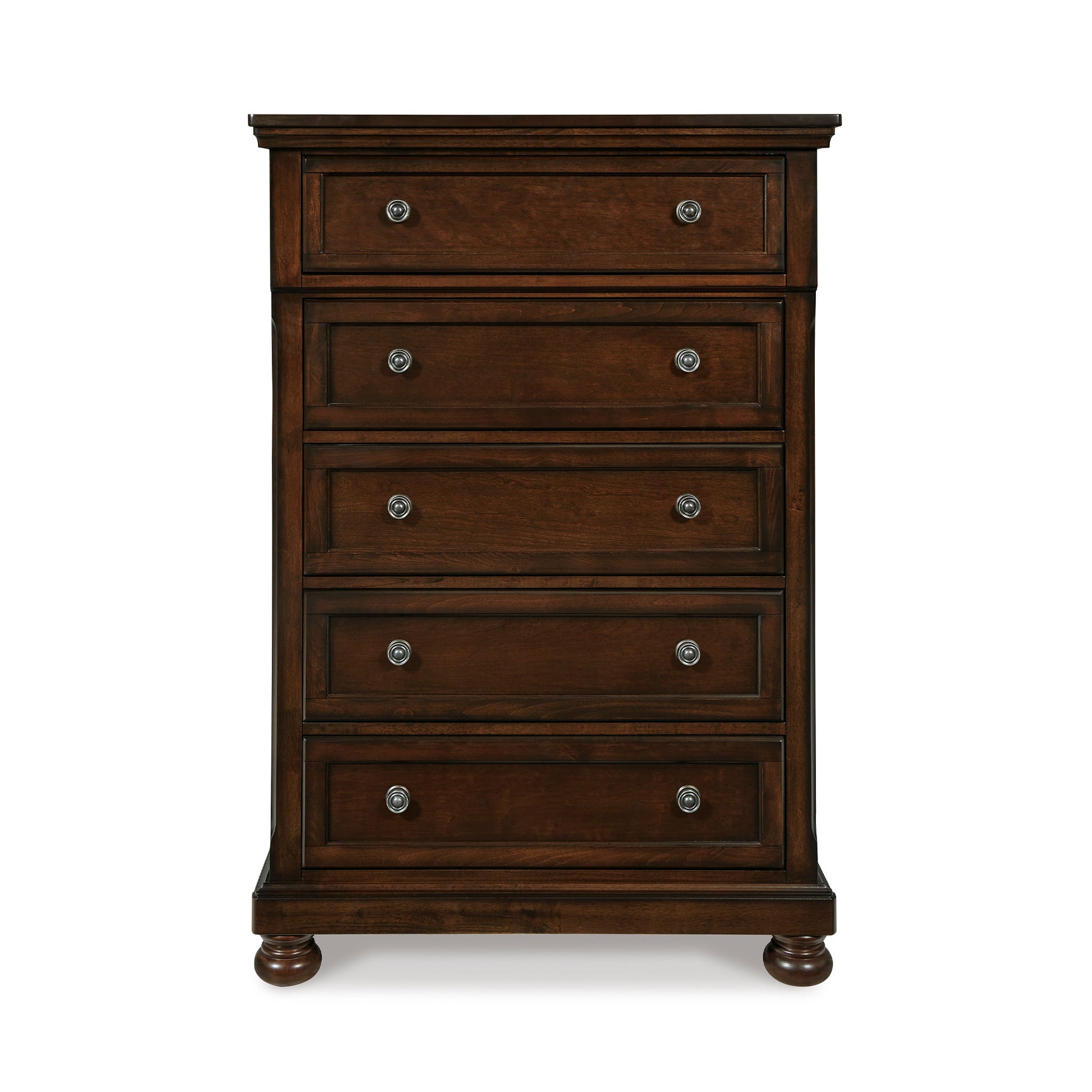 The quality craftsmanship is clear to see. The classic design elements—including antiqued hardware and bun feet—are easy to love. Satisfying your taste for traditional furnishings, this chest of drawers is elegant without looking fussy. Five roomy drawers keep your wardrobe organized in style.
