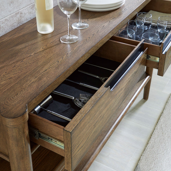 Give your modern or mid-century dining room that finishing touch. This dining server offers simple sophistication with a modern silhouette. Spacious drawers and open shelves provide ample storage and display space for dining essentials and decor. Picture yourself hosting guests with this gorgeous server—and bringing a little minimalism with big character to your home.
