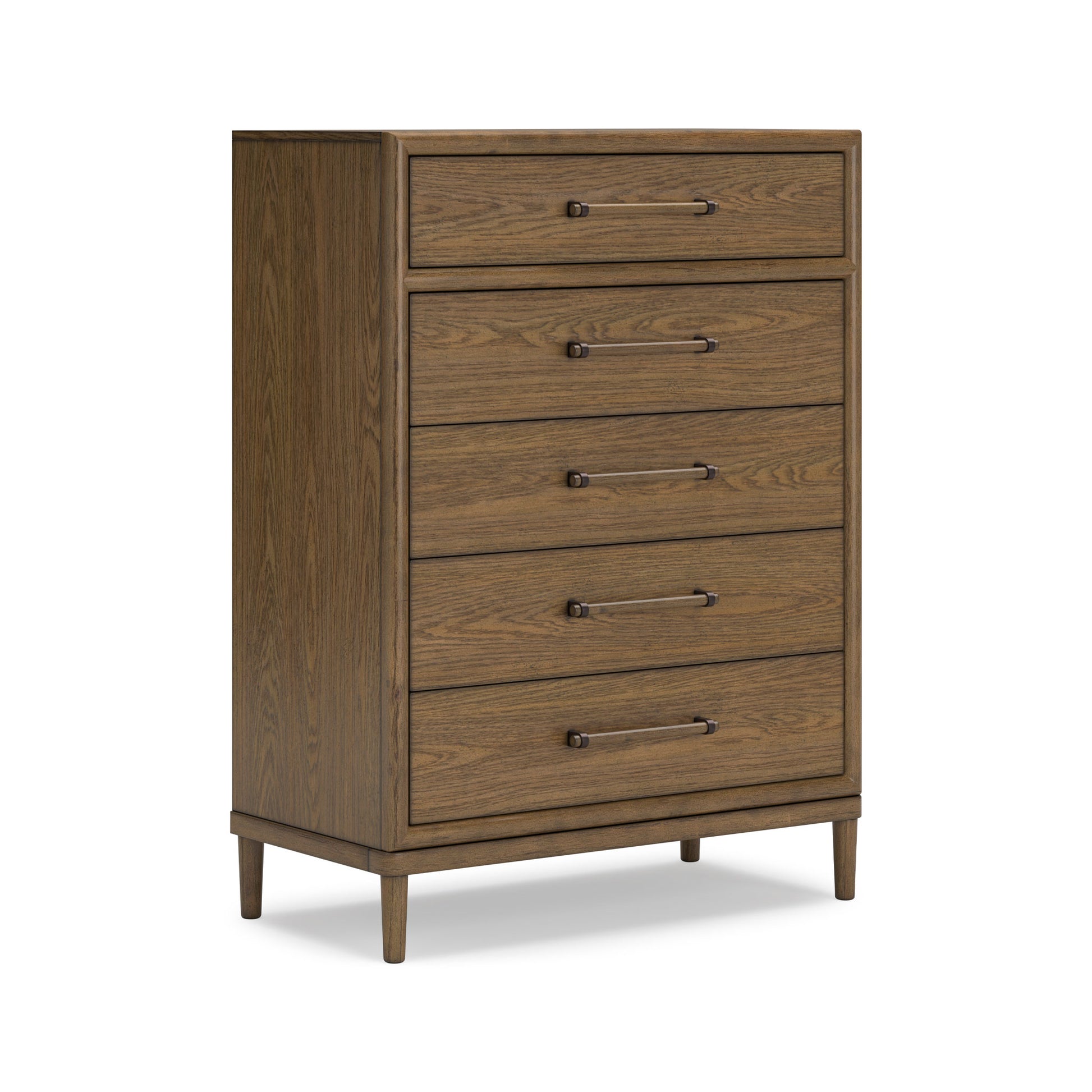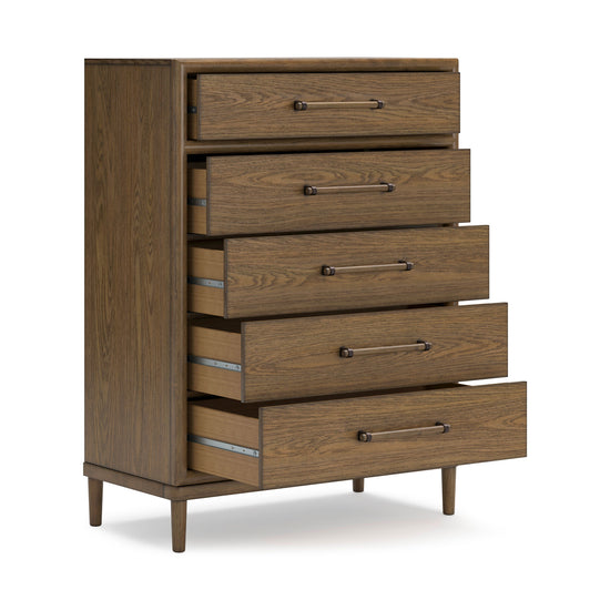 - 5 smooth-gliding drawers with dovetail construction, fully finished interiors and ball-bearing side glides (top drawer felt lined)
