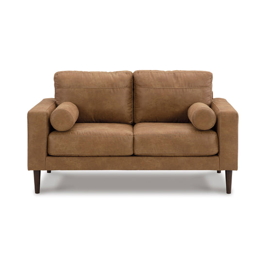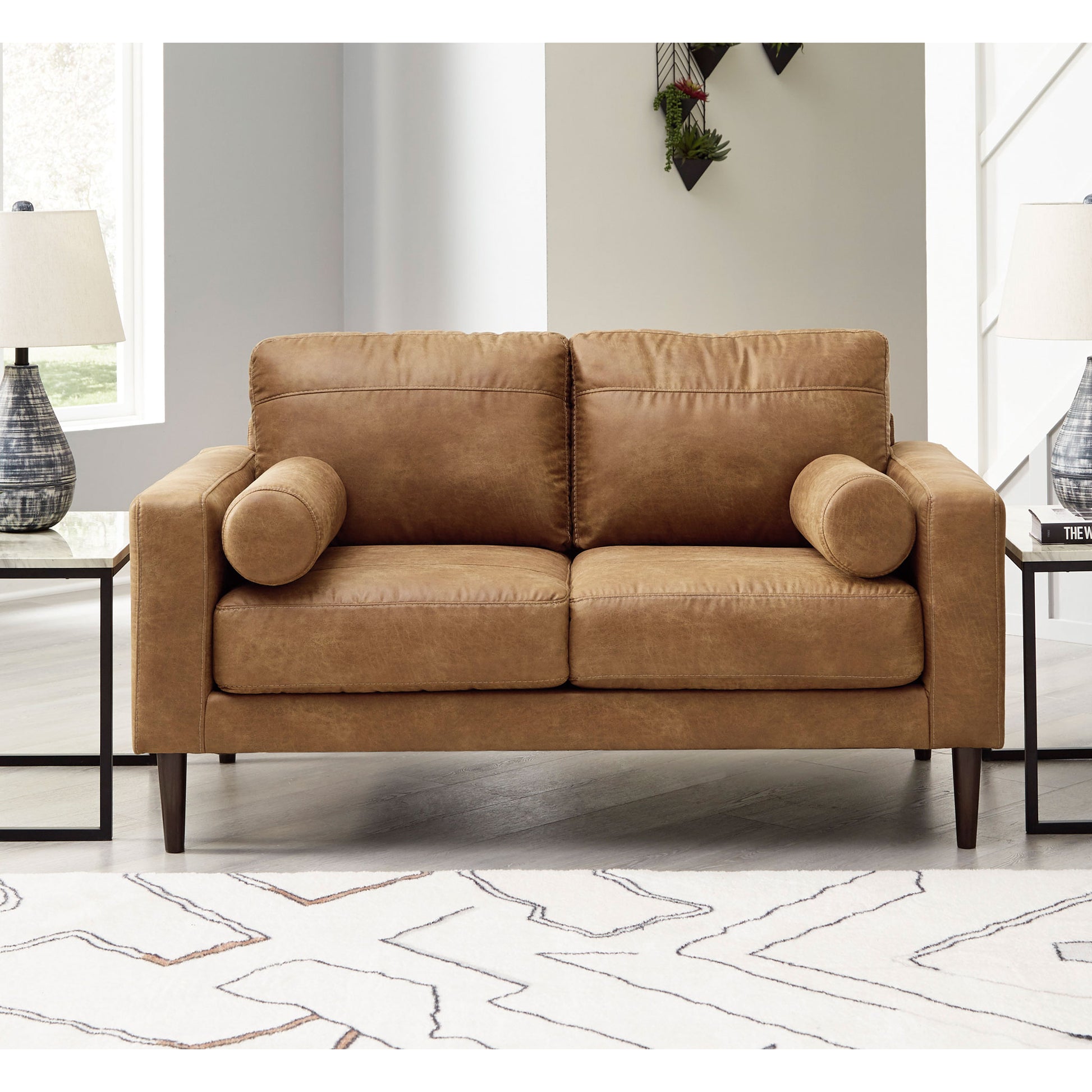 Small-scale style, tailored to perfection. This loveseat echoes retro aesthetics with warm caramel faux leather, while its ultra-linear silhouette incorporates a contemporary edge. Versatile in form and function, the seat suits styles from modern boho to transitional. And its size helps you to confidently curate your compact space without sacrificing comfort (or your budget).